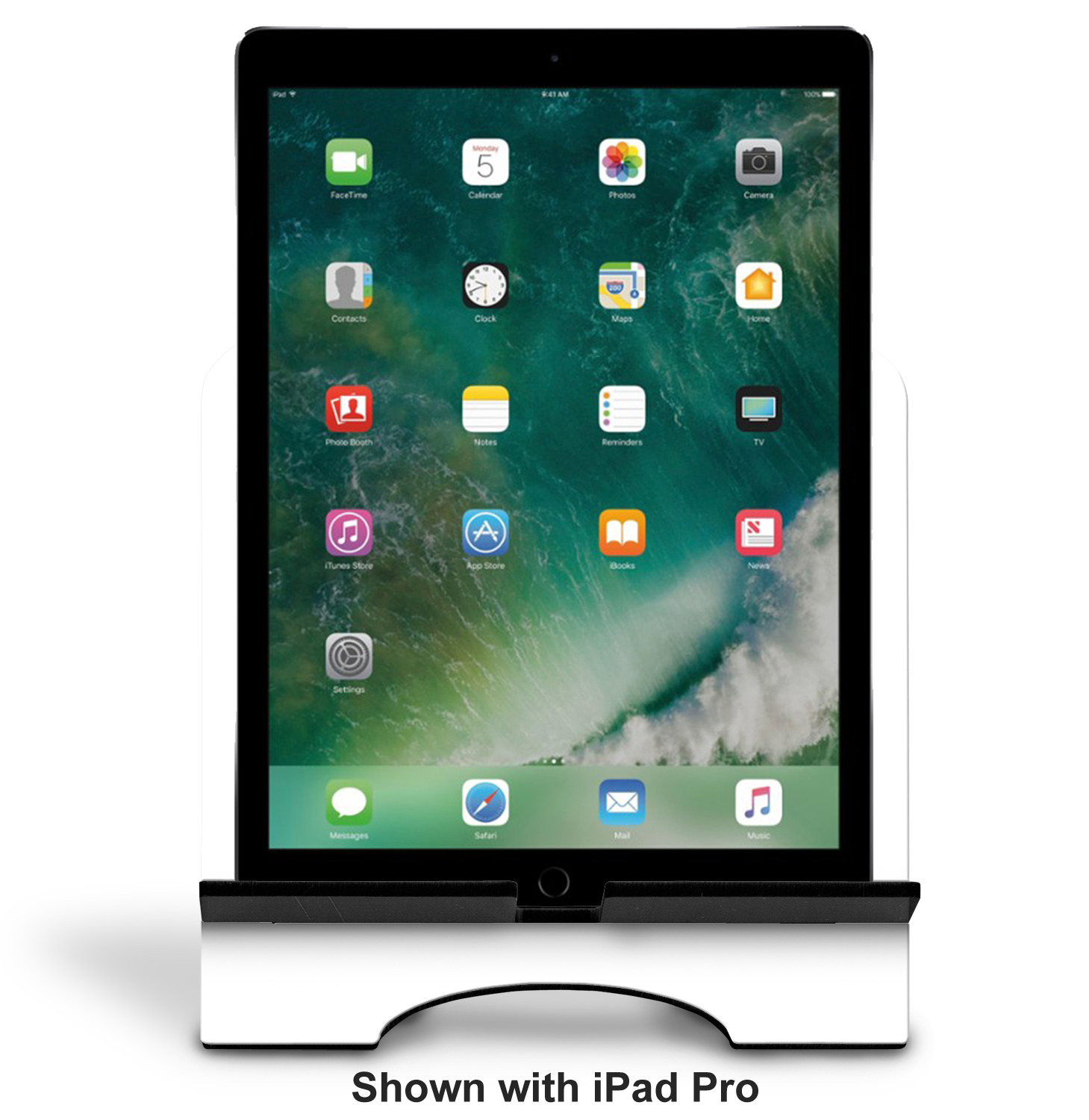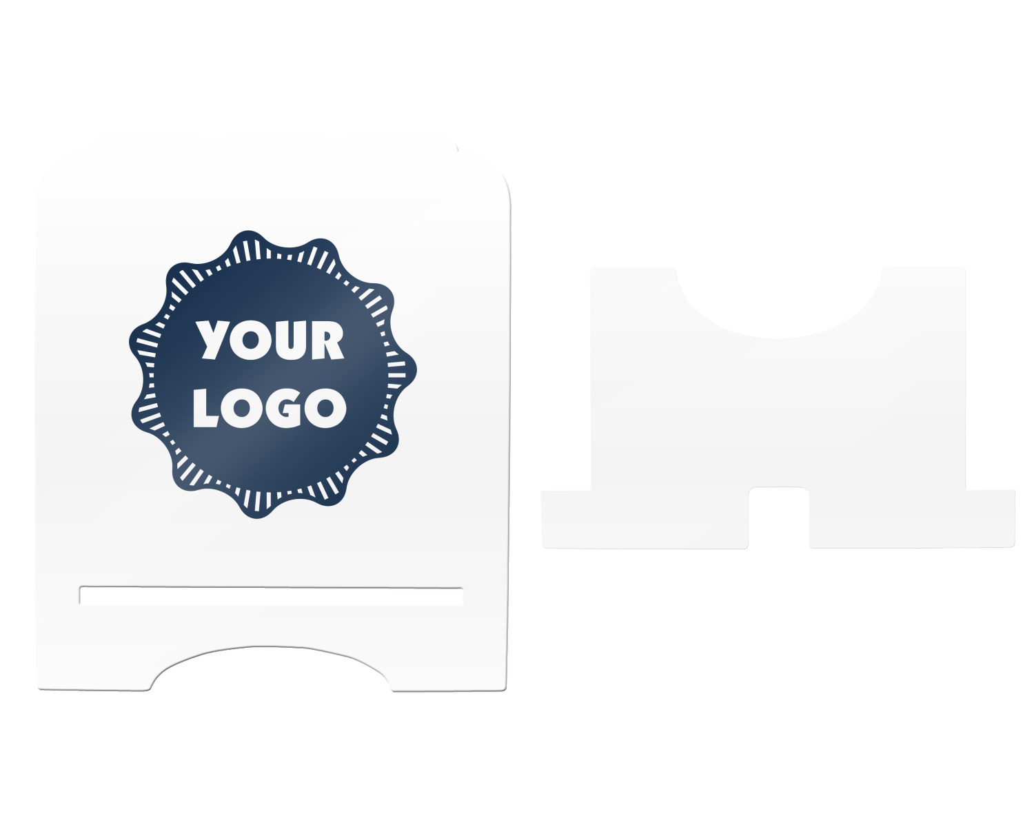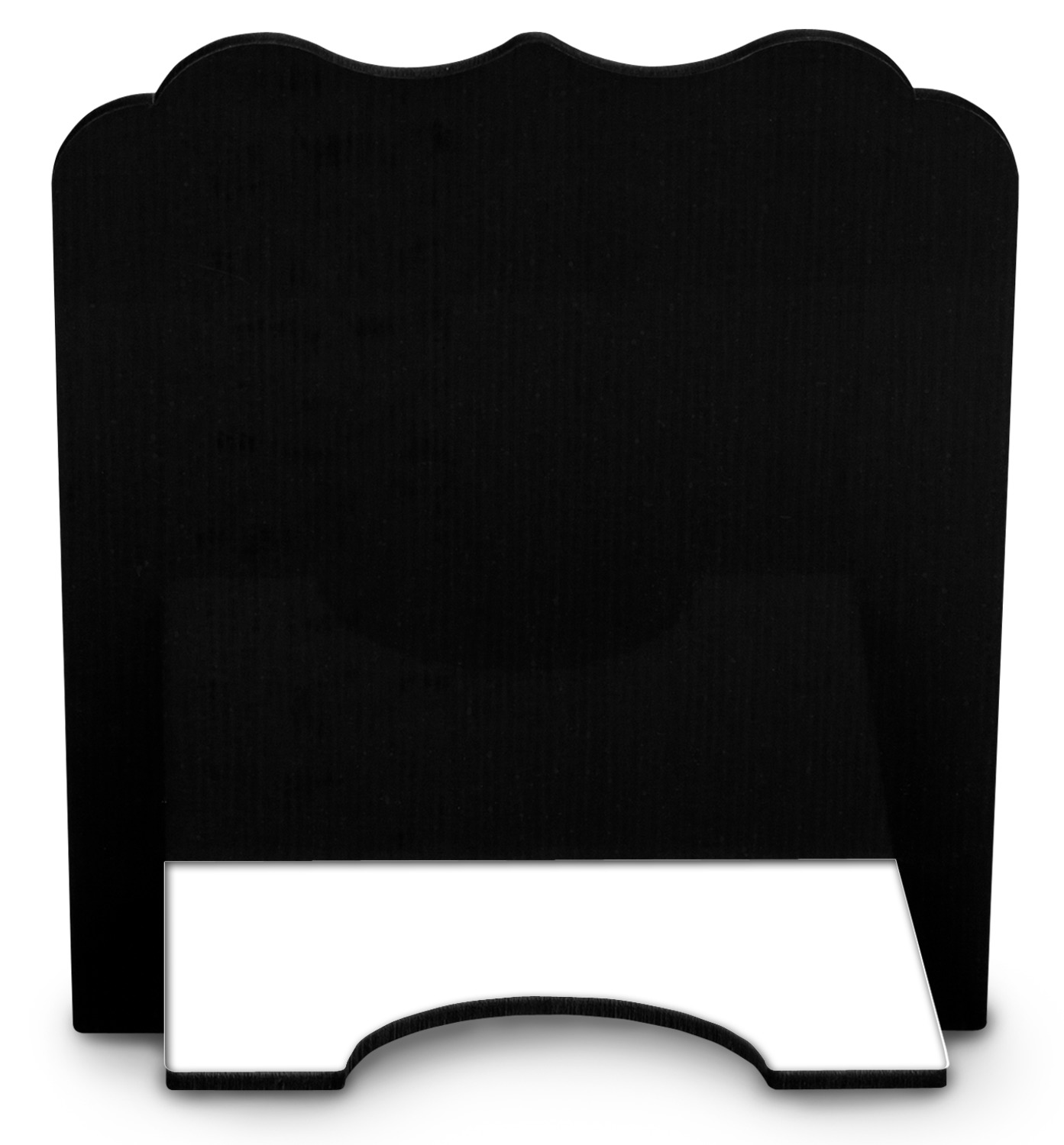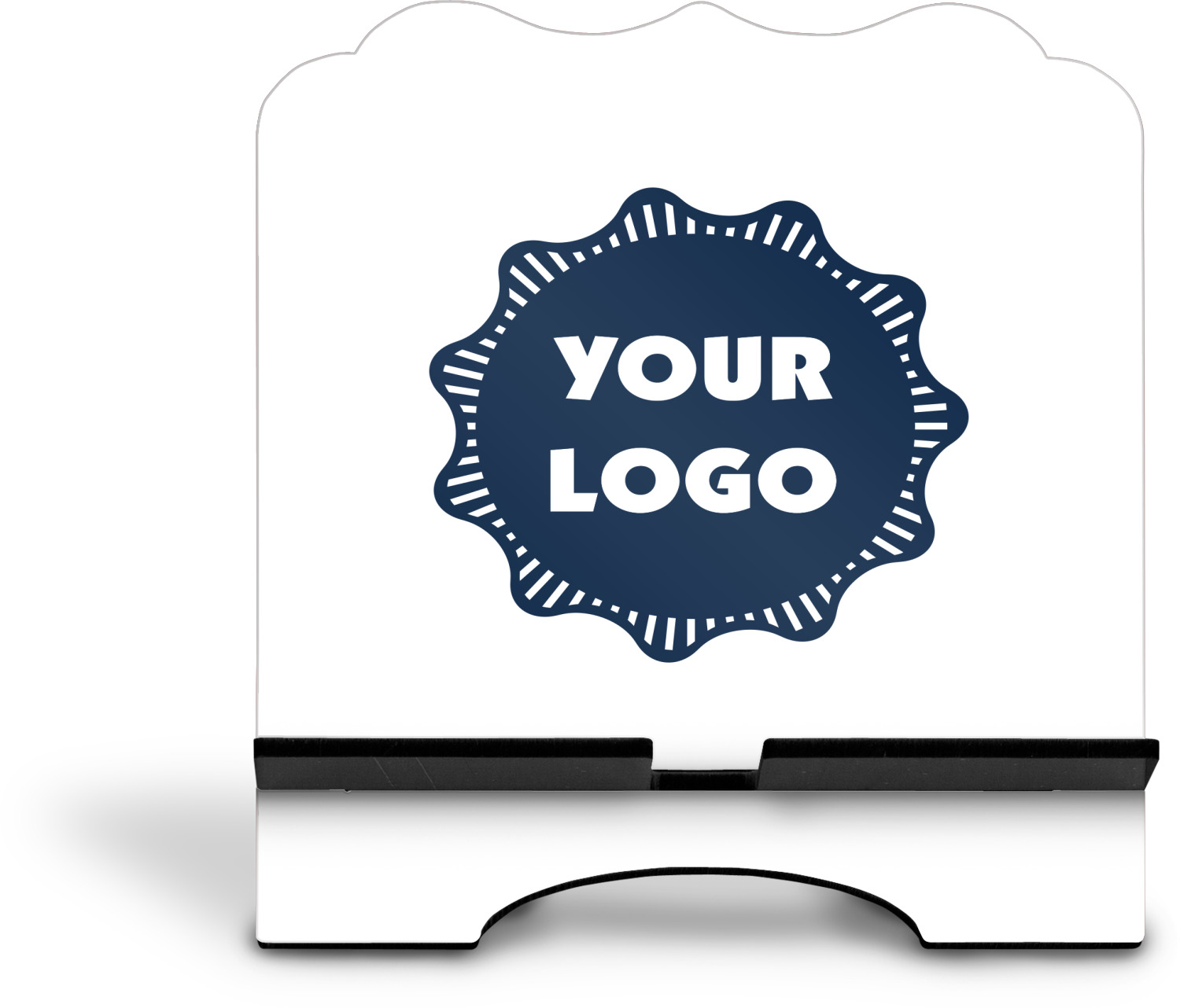 The stand is comprised of two hardboard pieces that fit snugly together and stabilize one another. The bottom part of the iPad stand supports your tablet, and has space for your tablets charger while in use. At 9.25" x 11.5", this tablet mount can support a device between the sizes of the iPad Pro and the iPad Mini 2. The uppermost part of the stand features a decorative, curved edge for a classy, suave appearance. We print your customization atop the face of the stand, in vibrant color. The remaining sides are colored a sleek black.