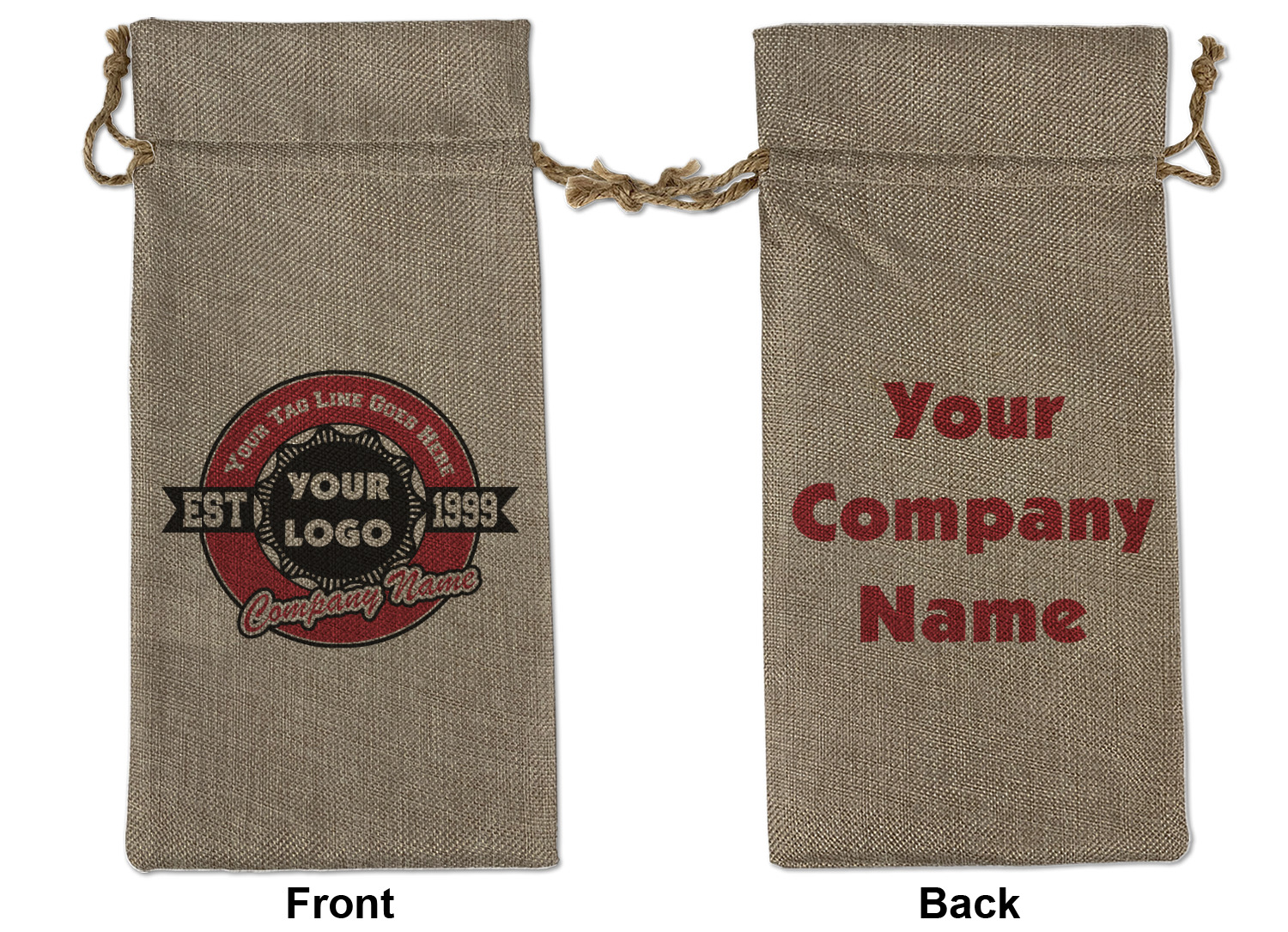 We sell our Burlap Gift Bags in 3 variant sized bags. Made with burlap polyester, each personalized bag can be secured with a twine drawstring pull. Your custom design is available to print on one side or both sides - completely up to you! The sizes of the bags measure approximately 4.5" x 6.5" for the smallest size, 6.5" x 8.0" for the medium size, and 6.5" x 13.5" for the large-sized bag.