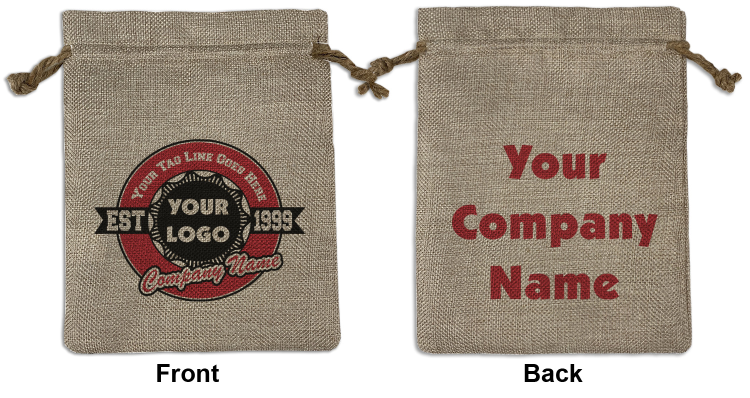 We sell our Burlap Gift Bags in 3 variant sized bags. Made with burlap polyester, each personalized bag can be secured with a twine drawstring pull. Your custom design is available to print on one side or both sides - completely up to you! The sizes of the bags measure approximately 4.5" x 6.5" for the smallest size, 6.5" x 8.0" for the medium size, and 6.5" x 13.5" for the large-sized bag.