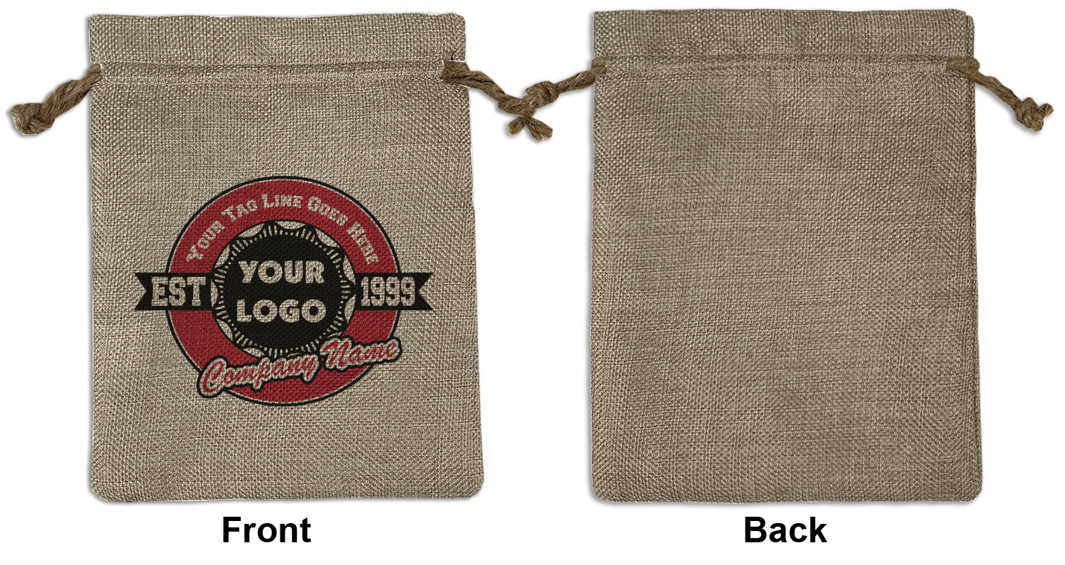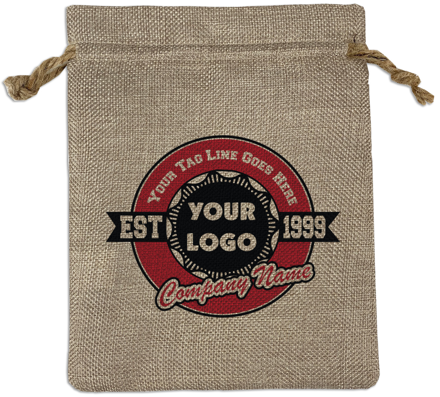 We sell our Burlap Gift Bags in 3 variant sized bags. Made with burlap polyester, each personalized bag can be secured with a twine drawstring pull. Your custom design is available to print on one side or both sides - completely up to you! The sizes of the bags measure approximately 4.5" x 6.5" for the smallest size, 6.5" x 8.0" for the medium size, and 6.5" x 13.5" for the large-sized bag.