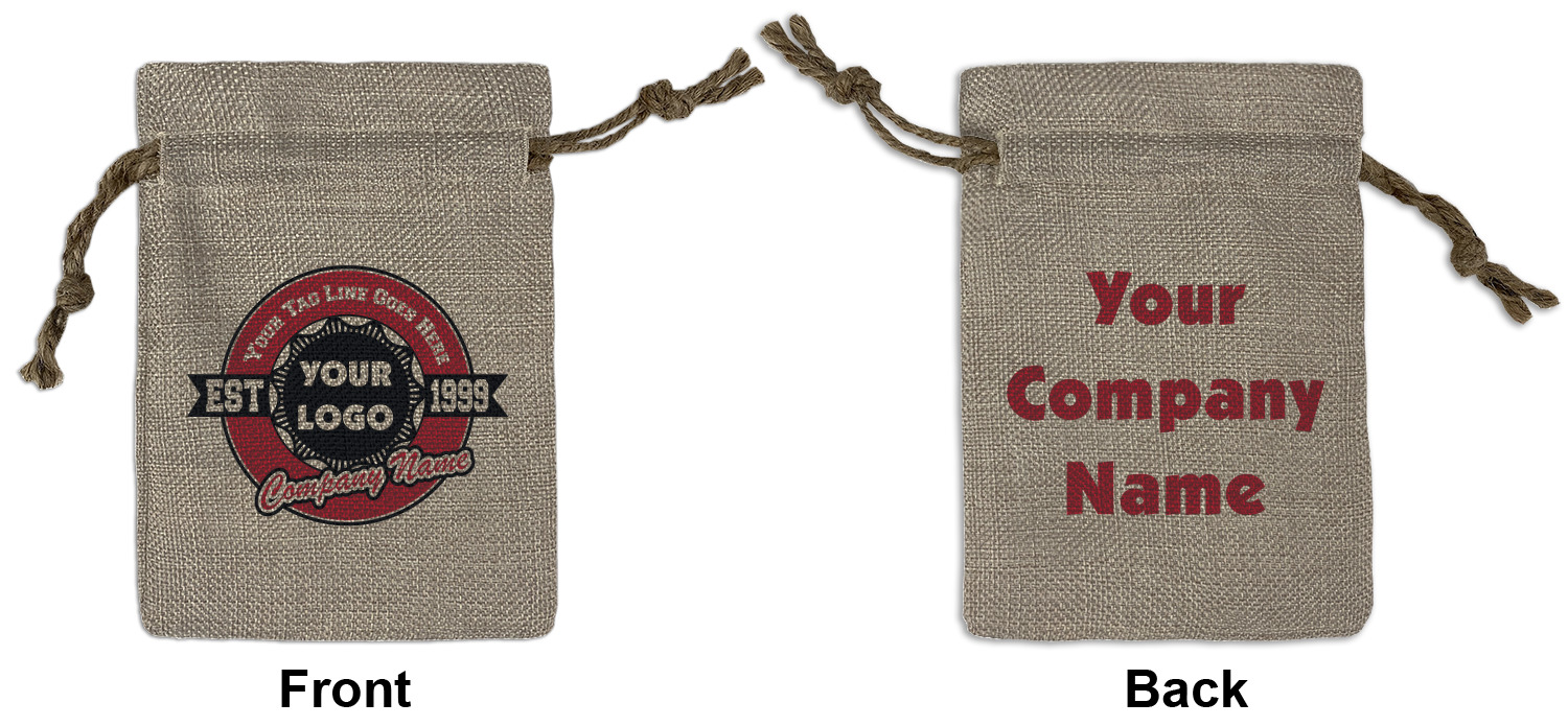 We sell our Burlap Gift Bags in 3 variant sized bags. Made with burlap polyester, each personalized bag can be secured with a twine drawstring pull. Your custom design is available to print on one side or both sides - completely up to you! The sizes of the bags measure approximately 4.5" x 6.5" for the smallest size, 6.5" x 8.0" for the medium size, and 6.5" x 13.5" for the large-sized bag.