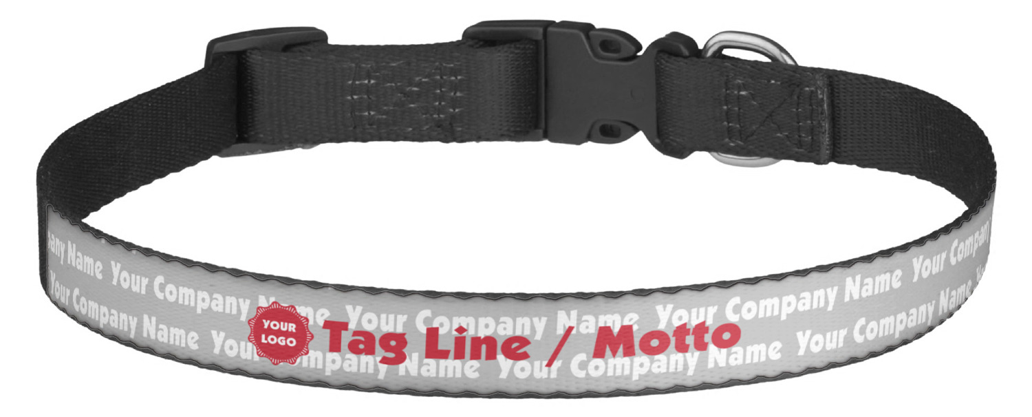 This sturdy collar, made from a durable nylon weave, will outlive your dog's episodes of excited tugging and pulling. Courtesy of its thick plastic buckle and adjuster, this collar is adjustable and accommodating of any dog. Structurally, the collar is a single piece of nylon weave that is sewn together, and features a solid metal loop where you can attach a leash or dog tag. We print and display your dog's name and pattern across the middle of the personalized dog collar.