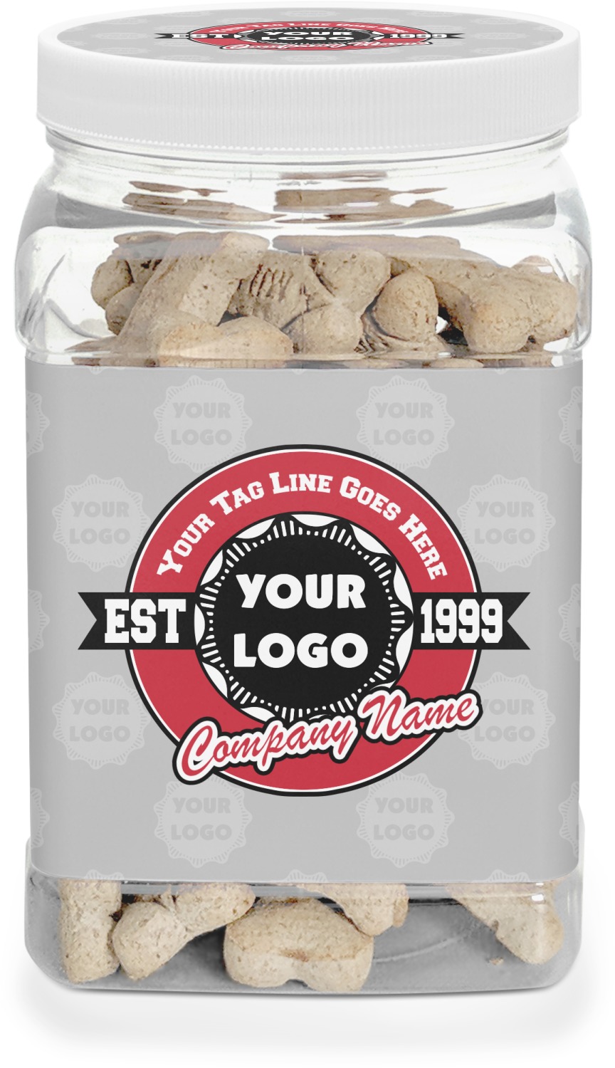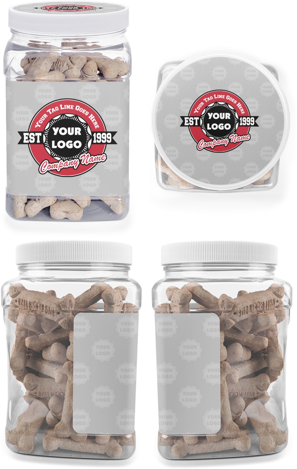 This half gallon jar, made from a sturdy plastic, is the perfect way to keep treats from any naughty pet paws, while still keeping them ready on hand for when your pup performs an impressive trick. This dog cookie jar features a screw-on, white lid that displays your personalized design on a vinyl sticker. We apply another customized sticker that wraps around the front and sides of the jar. Our dog treat jar also has indentations on the rear ends of the sides, which allows for convenient handling, and its square frame allows for easy storage.