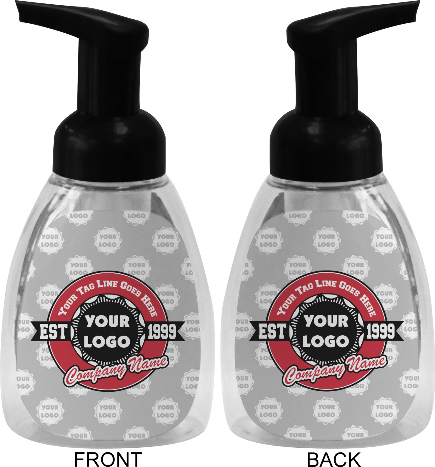 This soap dispenser is made of a robust plastic and has a clear base. The included soap pump is available in black or white color. This dispenser is 6.5 inches tall, 3 inches wide, and 2 inches deep. We display your customized designs on the front and back sides of these foaming hand soap dispensers.