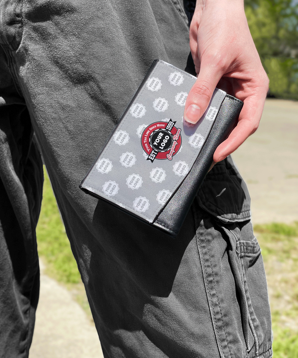 The compact size of this wallet - 5.5in wide, 3.5in tall and 0.75in thick when folded - makes it perfect to hold in hand and small enough to fit in a clutch or a normal size purse. The outside flap is customized with your choice of artwork and closes with a snap closure - with two different snaps to allow it to be adjusted when storing more items - to securely fasten the flap.