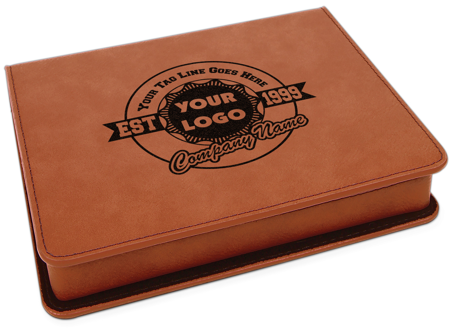 This set includes a wine stopper, pourer, drip ring, and a corkscrew! The exterior of the box is a gorgeous, cognac-brown leatherette, while the interior is covered in a black, velvety material. Four foam indentations, unique to the shape of the wine tool, are found at the bottom half of the box's interior. The tools fit snugly into each of their designated spots, and the foam material helps to protect the integrity of your tools. Each of the wine gadgets features a bamboo accent, with the location and style depending on the tool itself. We laser engrave your personalized design onto the lid of the box, which easily flips open and is secured closed by a small magnet. The wine accessories box measures at 7 by 5.5 inches in total.