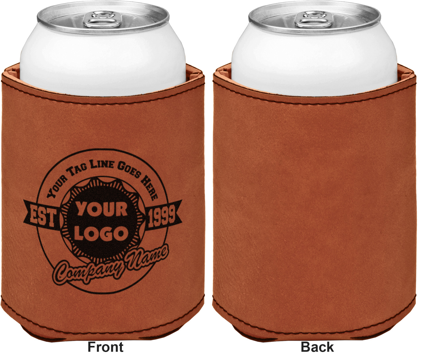 This can sleeve is made from a cognac-brown leatherette and stitched with a sturdy, black thread. A slim padding lines the inside of your can sleeve to allow for a better fit once your drink is inserted. The sleeve itself measures at 4 by 4.5 inches, allowing this custom can sleeve to accommodate most canned drinks. Your personalized design can be engraved on the front and back, or solely the front. When laser-engraved, your design appears as a black coloration which contrasts the leatherette nicely.