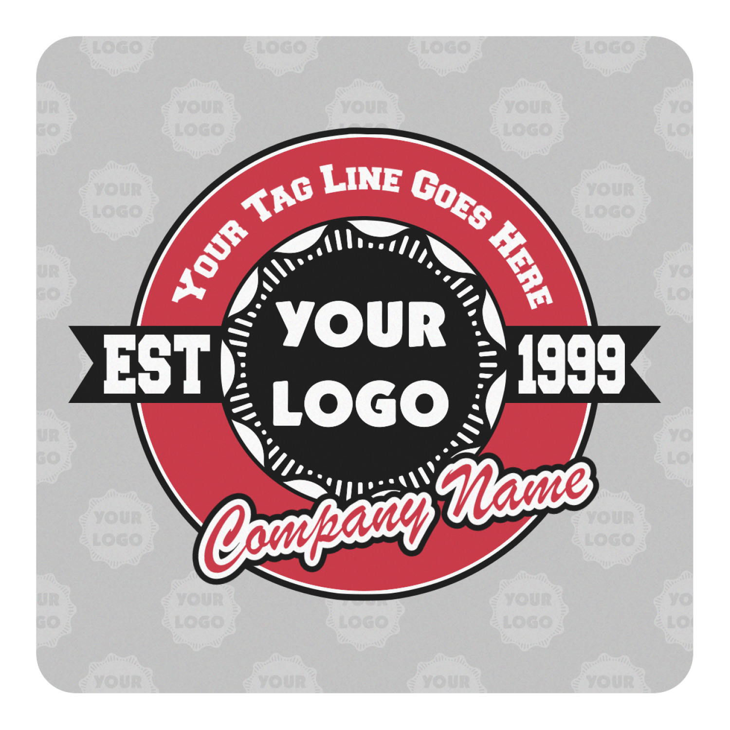 This design has black, red, and grey as its main colors, which are able to be changed to your company colors with a click of a button. You are able to upload your logo right into our system in order to use it. We have set up a fun company logo that you are even able to simply add your logo to. The background has a subtle logo pattern, which you can upload as a png or svg of your own logo. All colors, graphics, and text are changable in order to suit your personal business. Use your logo and your tagline on all kinds of products to get your business known.