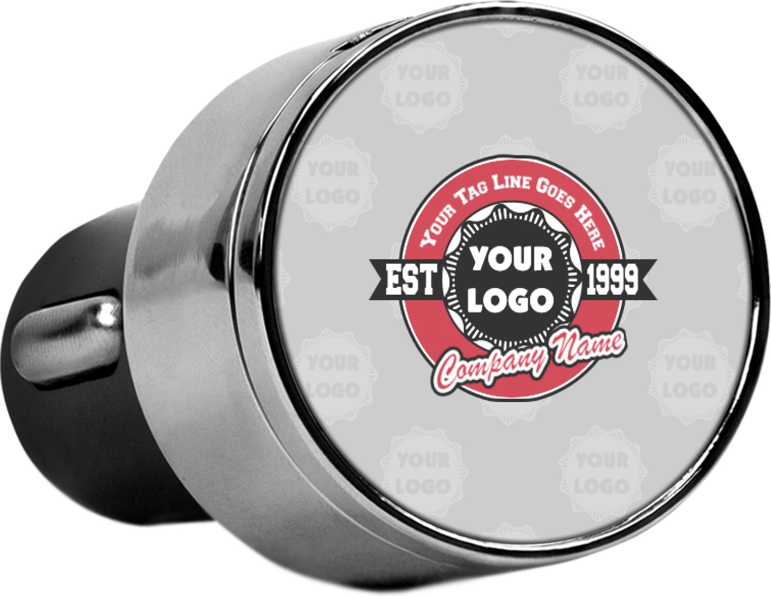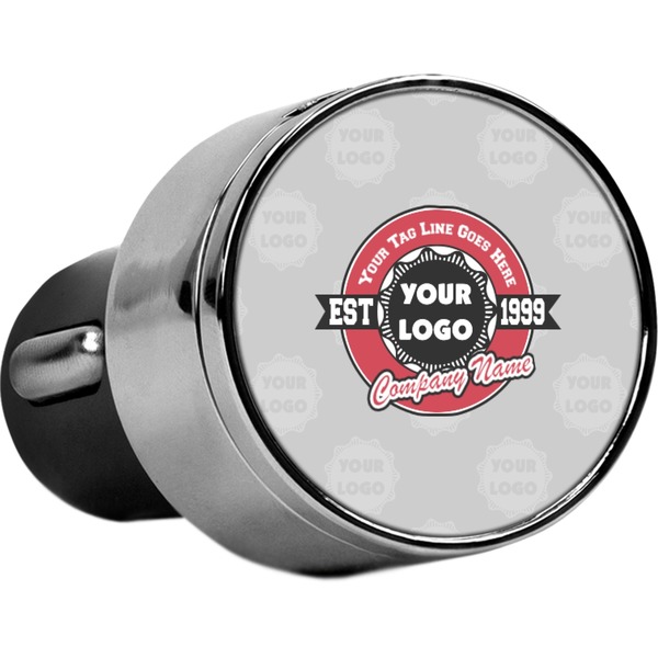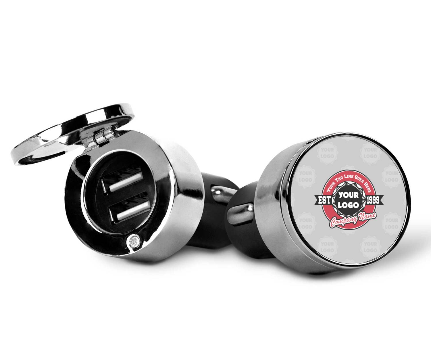 This car charger adapter converts your cars bland cigarette lighter into a decorative, personalized, and operational USB charging port. Made of solid, silver-plated metal, these chargers feature a flip-open lid that both displays your customized design and conceals two USB ports. The metal lid of the USB car charger adapter is 1.5" in diameter and seals due to a small, ingrained magnet on both the charger and its lid. The cigarette lighter insert, itself, is colored black.