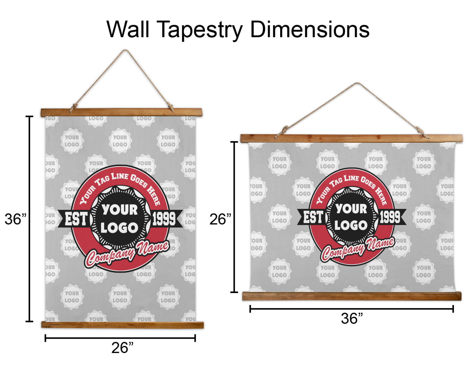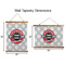 Made in two different orientations - portrait or landscape - both are 26" x 36". Your design is printed on a high quality polyester fabric with hemmed edges. The wood on the top and bottom of the tapestry is 1.25" tall and 0.25" thick and there are two pieces on top and bottom which sandwich the fabric.