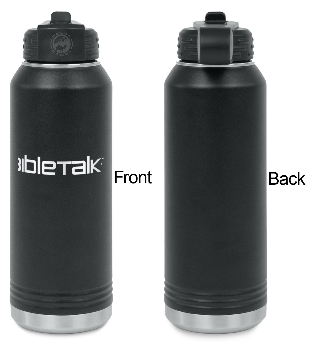 These 32 oz. water bottles are constructed from 18/8 durable food grade stainless steel. The inside of the water bottle is silver; while the outside is powder coated black