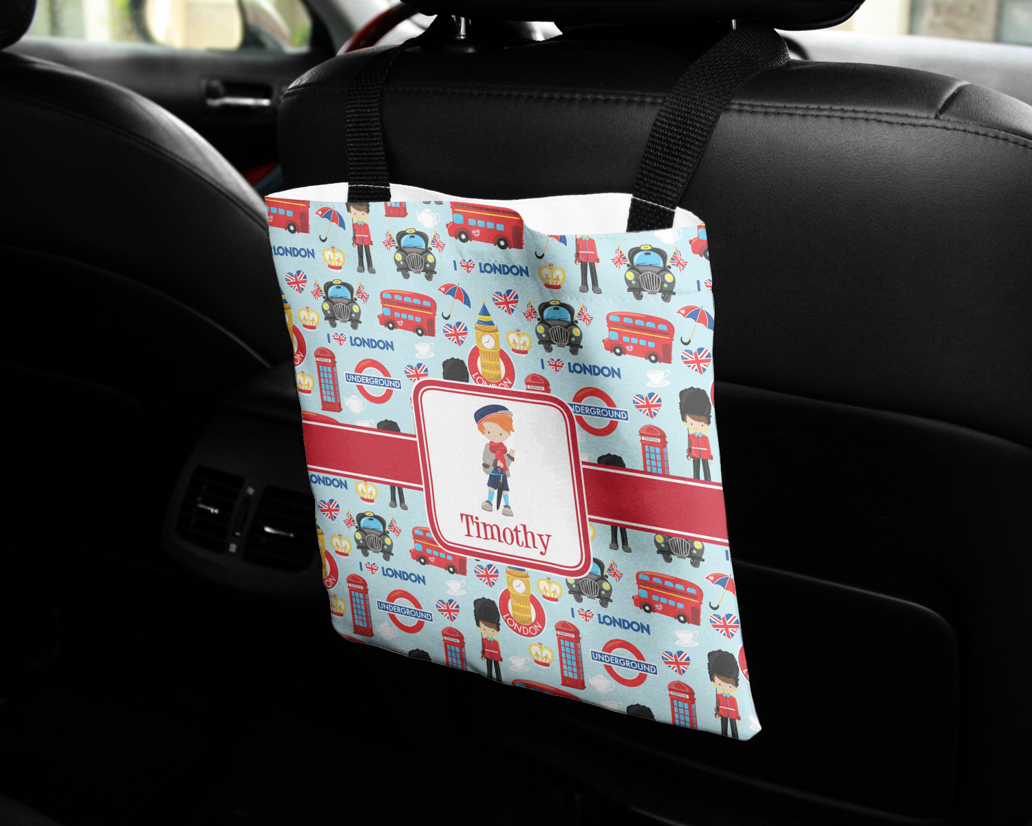 These car back seat organizers are sturdy tote-like bags, fabricated from a robust polyester, and features a single handle on the back side. The strap features an attachable velcro for easy attachment to headrests, grocery carts, car seats, and more. Simply undo the velcro, loop the strap around the headrest, reattach the velcro, and let the organizer hang from the front seat. These car organizers are the perfect means of increasing your backseat's legroom, while storing multiple items in one place for better accessibility. Each car back seat organizer measures at 10 by 10 inches, and features your personalized design printed across its front and back.