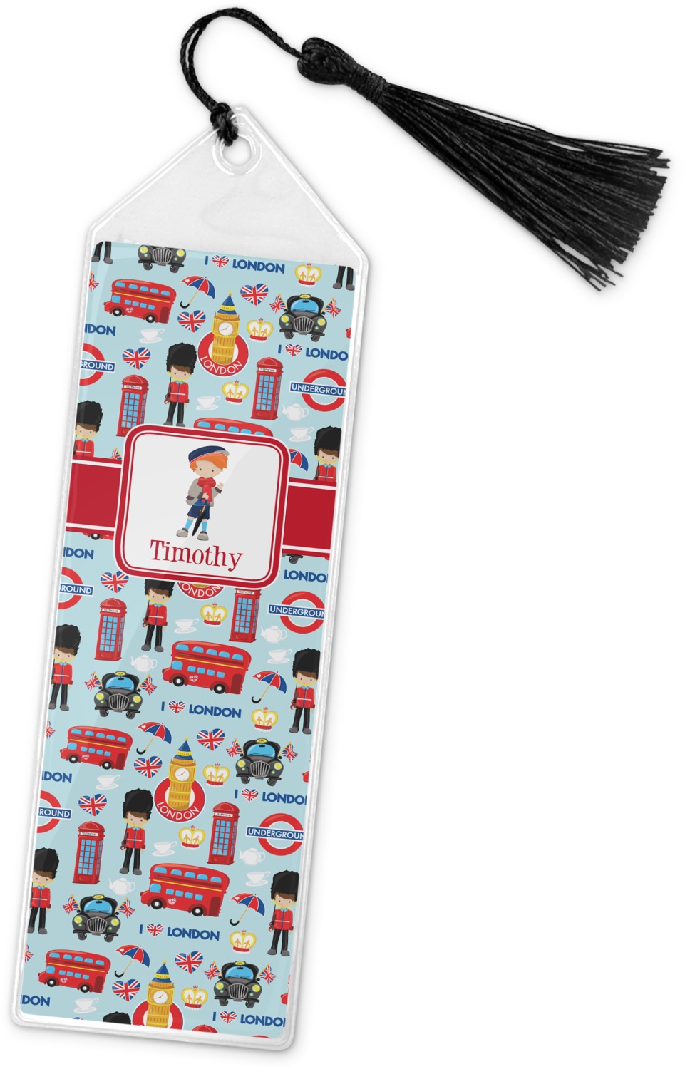 Your personalized bookmark is made of a sturdy, clear vinyl, and is approximately 7.5" x 2.25". We display your personalization on vinyl inserts that are placed on both sides. Accompanying each book marker is a black, fringe tassel that attaches to the reinforced, triangular header.