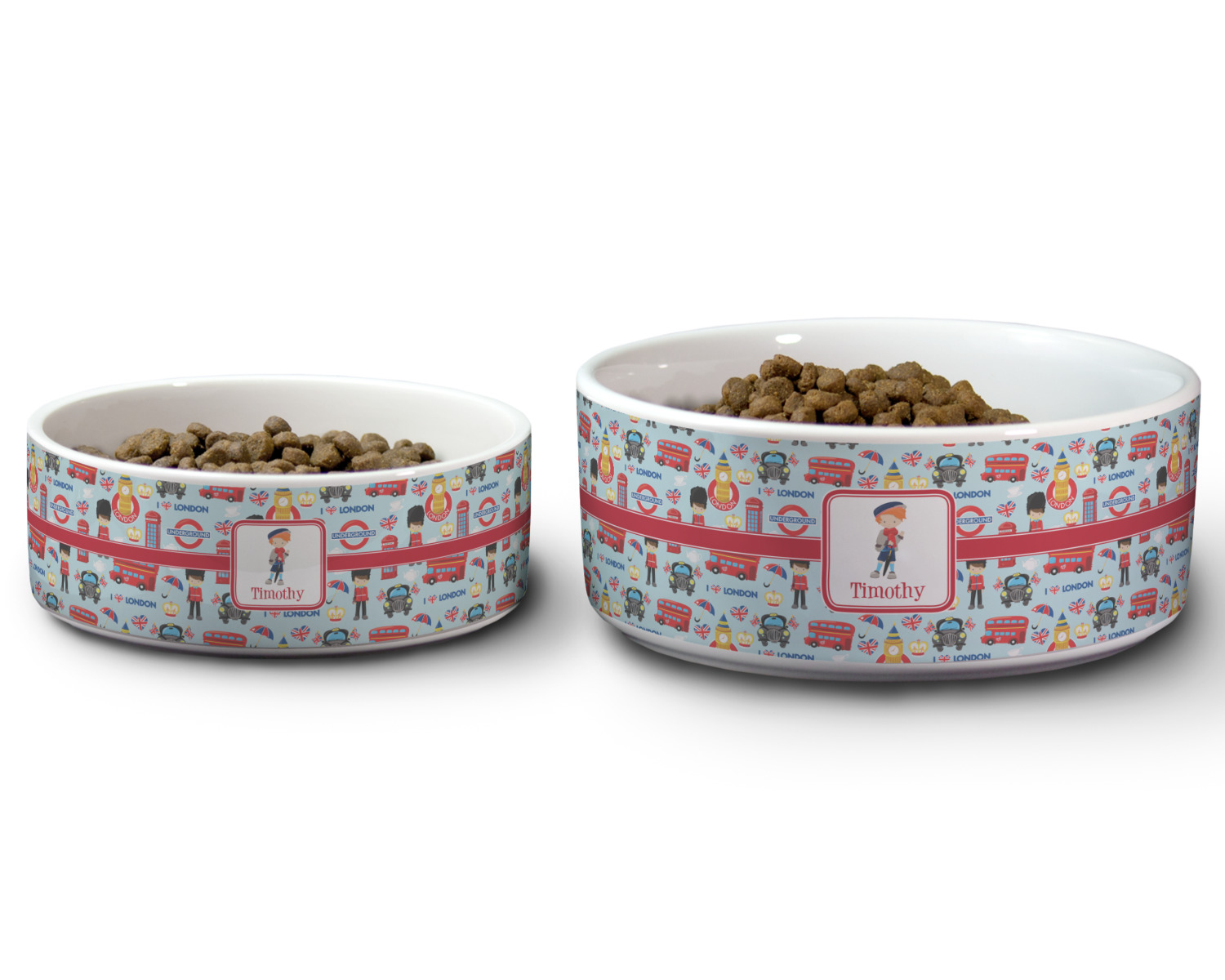 Our customized, ceramic dog bowls allow you to fashion a durable, yet expressive gift for your pet. These bowls are fashionably versatile; they suit both cats and dogs and can hold either food or water. Add your pet's name or favorite color to the design, and spruce up his/her eating area with one or two personalized pet bowls!