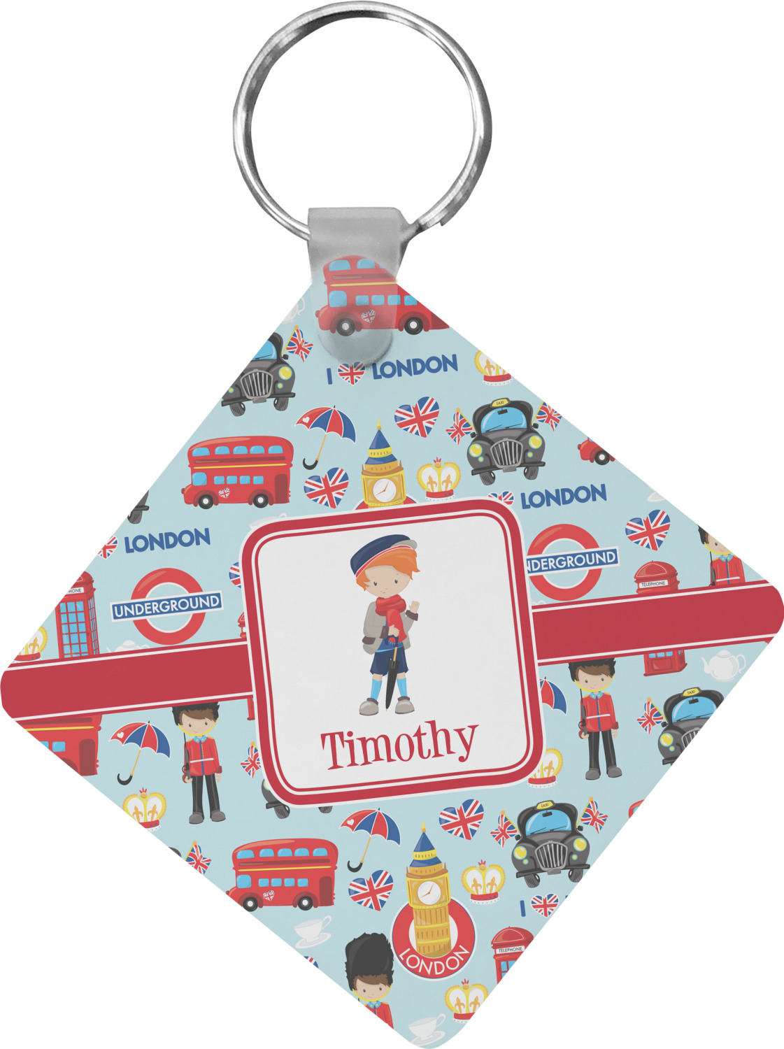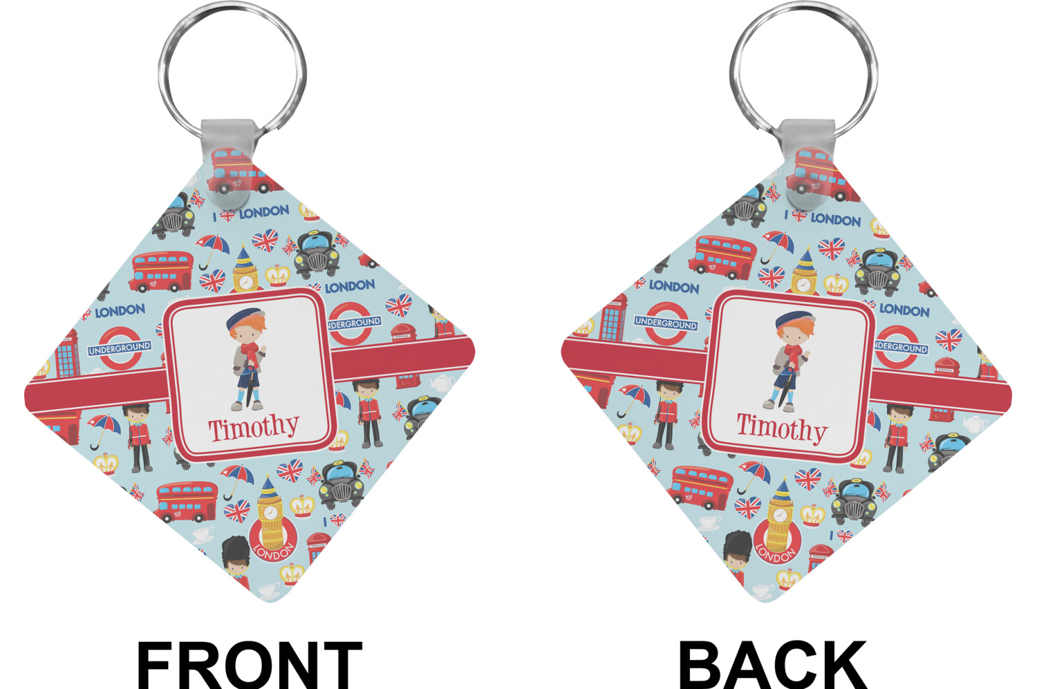 Our personalized keychains attach to the included metal, split key ring with a plastic, removable snap. Since a metal ring is included with your purchase, you have the liberty to keep your keys together on the ring, with or without your unique keychain. We offer this keychain in three different shapes: circle, heart, or diamond. We print your personalized design(s) on both sides of the key chain, and the surface has a glossy, reflective finish that only emphasizes your design. Each keychain is approximately 2.25 by 2.25 inches.