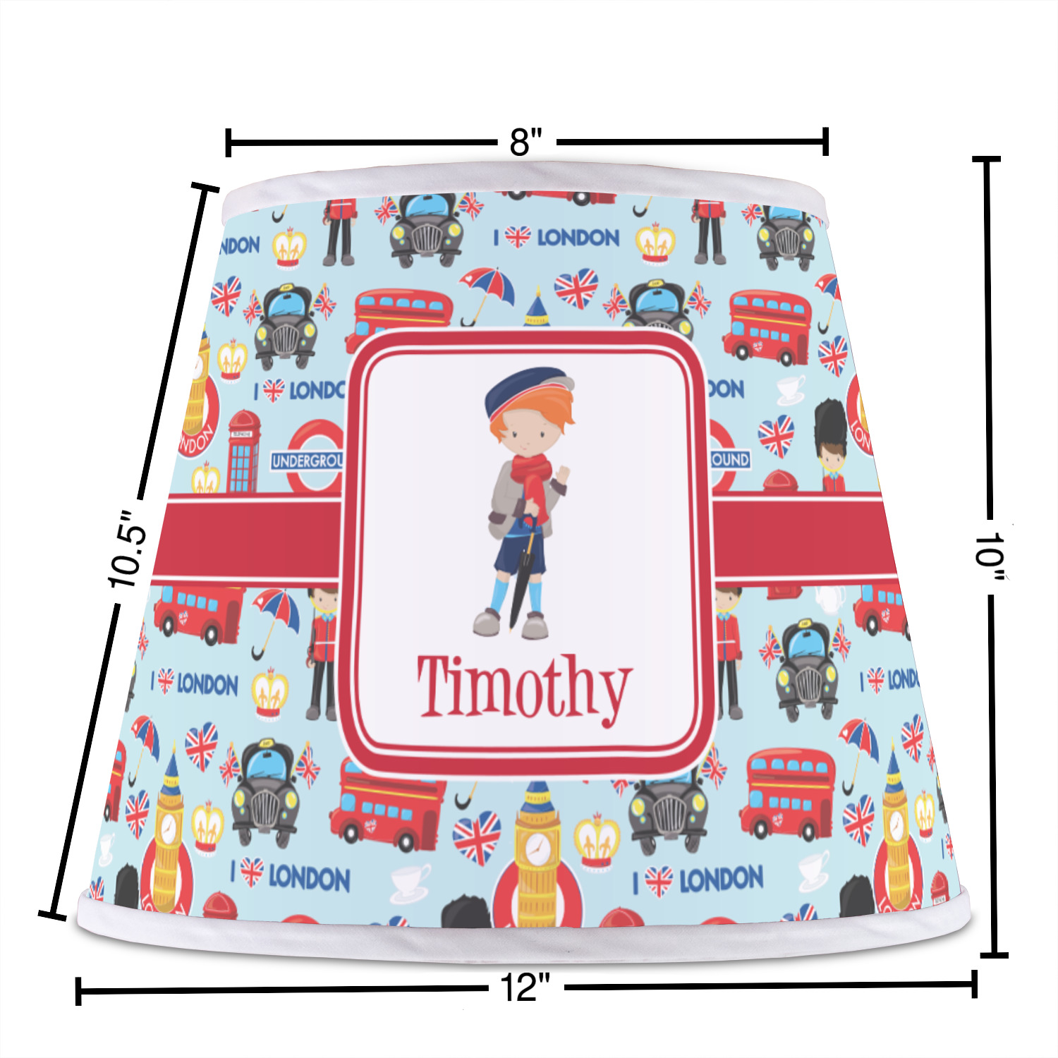 The base of this lampshade is 12 inches in diameter, and the top spans 8 inches in diameter. The total height of the lampshade is 10 inches. The angled nature of this custom lampshade concentrates the light, making it ideal for smaller spaces. This lampshade is made of matte, polyfilm, and displays your customization in its middle. The top and bottom of this colorful lamp shade are lined with a white fabric ribbon (which can be replaced with black inside the design studio) which frames your design and creates a sophisticated finish. As an UNO fitter lampshade, this unique lamp shade will fit a variety of bases.