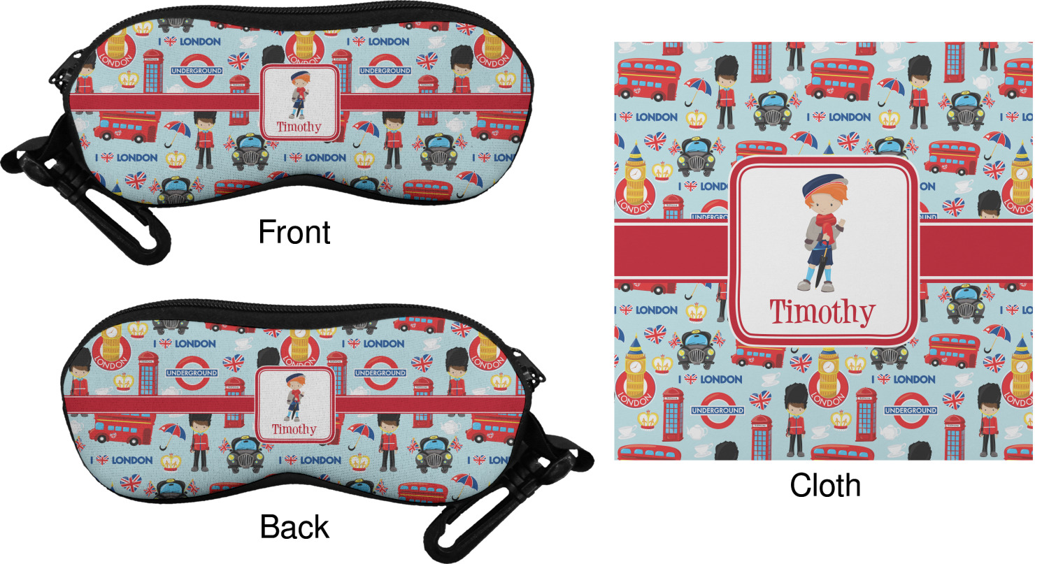 The cases have the design on both sides, a black zipper, and clips for hanging on a belt buckle or purse strap and also include matching lens cloths.