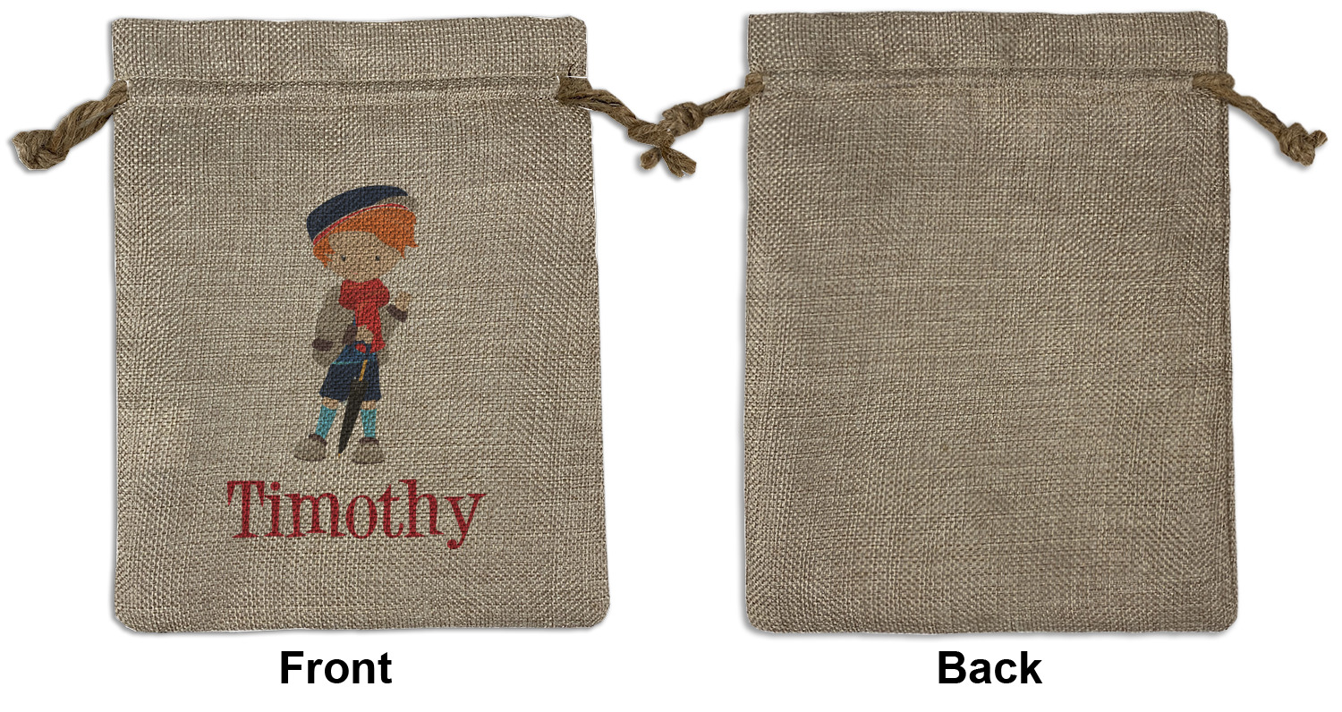 We sell our Burlap Gift Bags in 3 variant sized bags. Made with burlap polyester, each personalized bag can be secured with a twine drawstring pull. Your custom design is available to print on one side or both sides - completely up to you! The sizes of the bags measure approximately 4.5" x 6.5" for the smallest size, 6.5" x 8.0" for the medium size, and 6.5" x 13.5" for the large-sized bag.