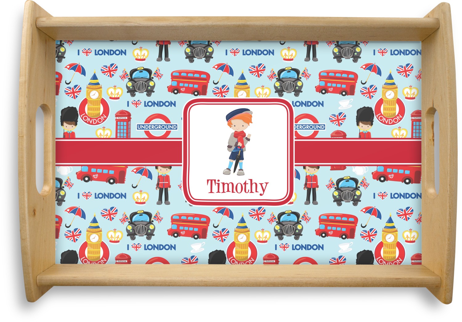 This serving tray with handles features square edges and two rounded sides, creating a very modern look. Each side is fabricated from a beautifully cut, natural wood. The bottom of the interior of the tray displays your customized design in bright, vibrant color. The tray is sold in both a black color and a natural wood look. Each variation of the wood serving tray has two sizes: Small, which is 14" x 10" x 2.25", and Large, which is 19.5" x 13.5" x 2.75".