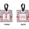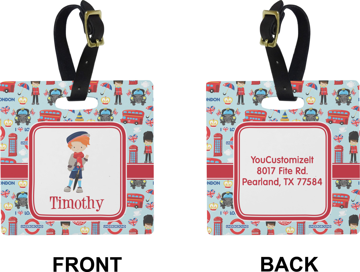These personalized bag tags are sold in a variety of shapes, so that you may find the product that meets your vision exactly. We sell a round luggage tag, which measures at approximately 4" x 4". Our square luggage tag is about 3.5" x 3.5", while our rectangular version is 2.75" x 4 ".