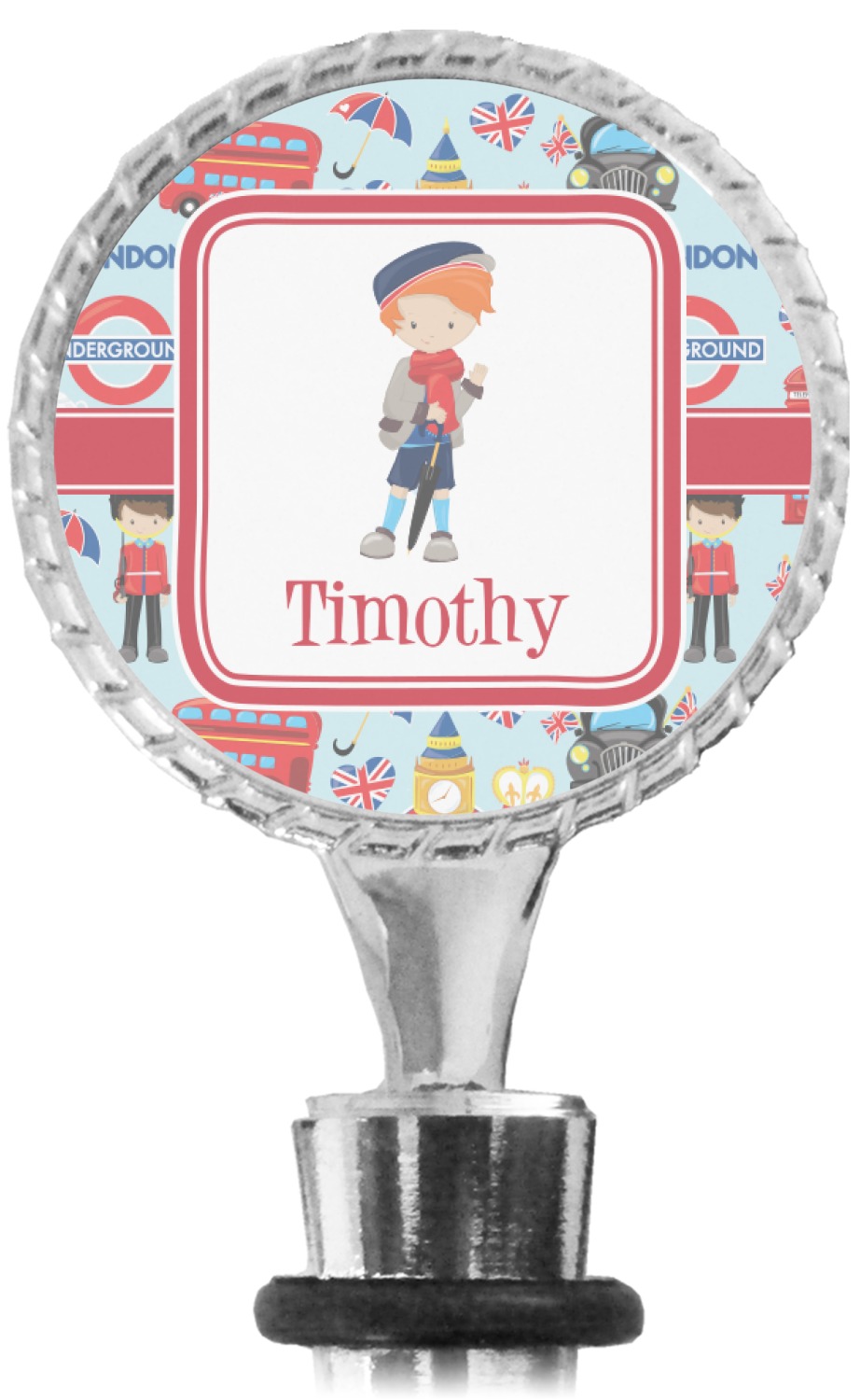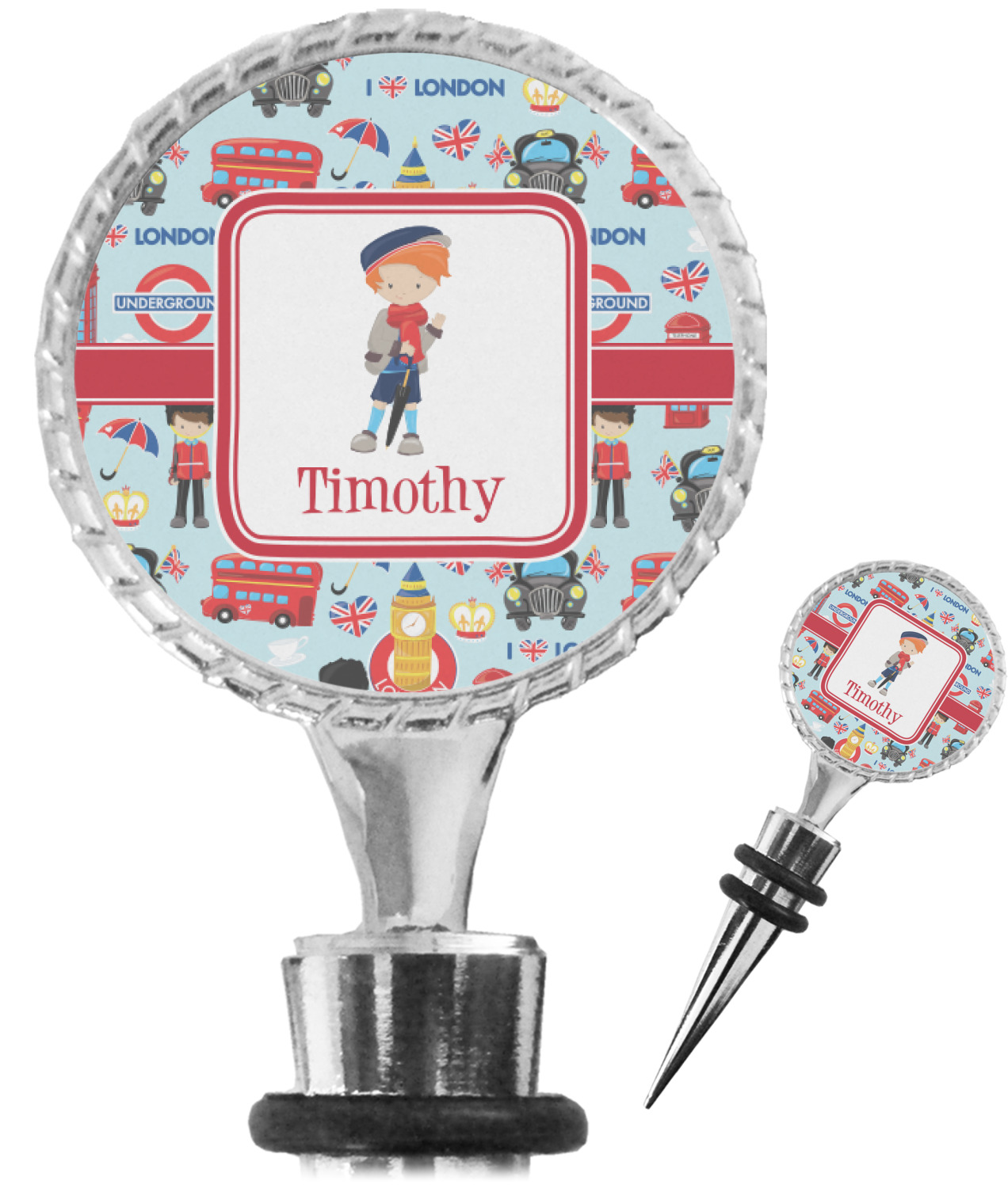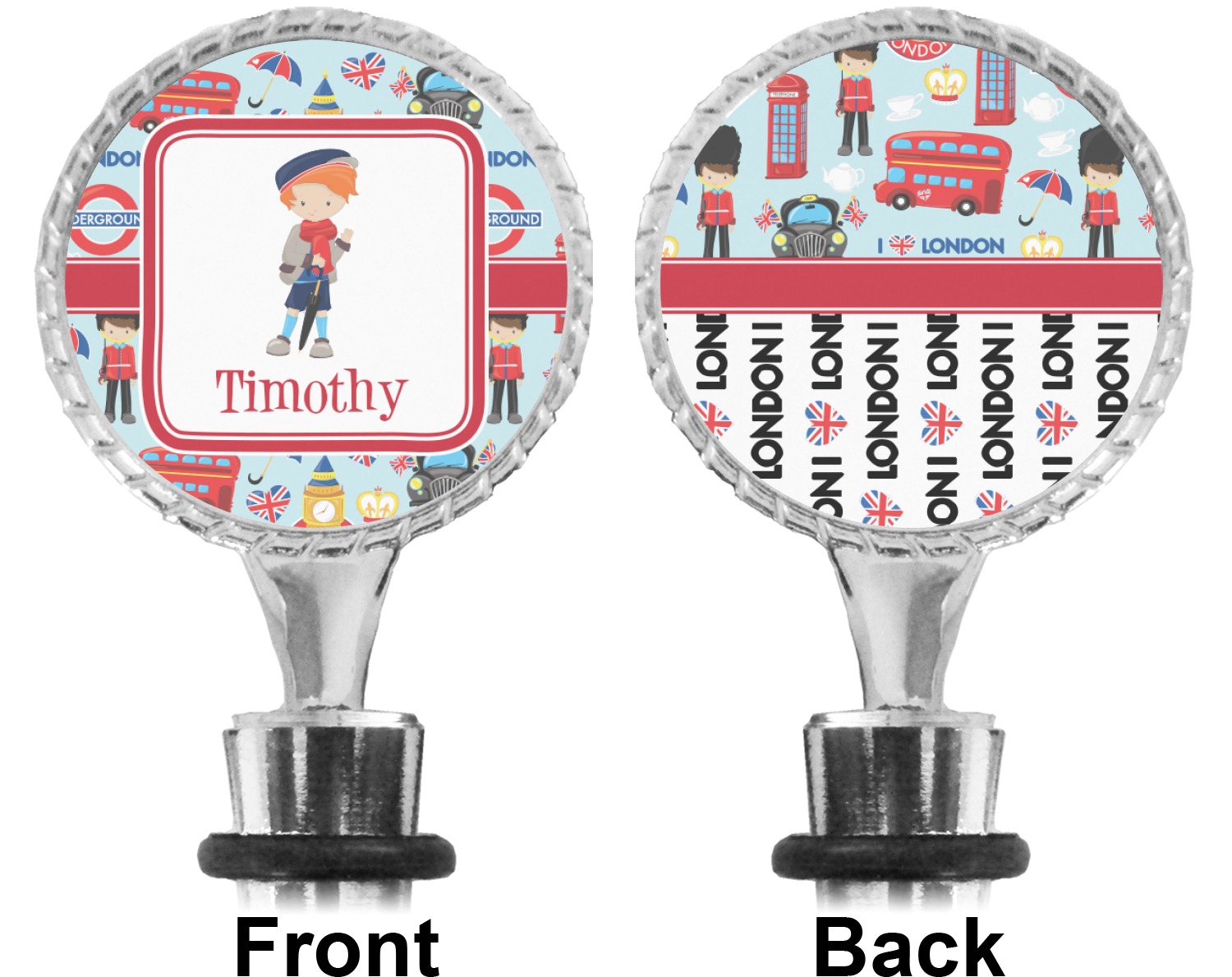 The top part of your bottle stopper is comprised of a zinc ring that displays your customization(s) in its middle, on both sides. The ring is heavy duty, with a bright chrome finish. The body of the wine stoppers have two silicone rings to provide an airtight seal. These wine bottle stoppers measure at 1.625" L x 0.8125" W x 4.625" H; your custom wine stopper is meant to fit into most standard-sized wine bottles.