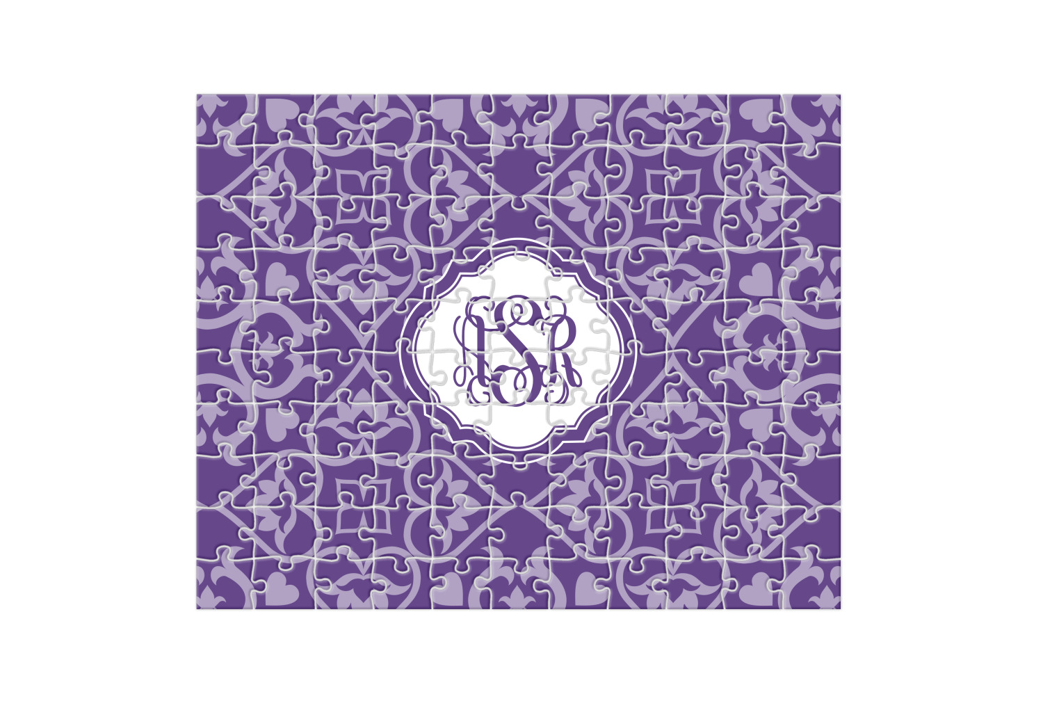 A purple scalloped label highlights a classic personalized monogram or the personalization of your choice.
