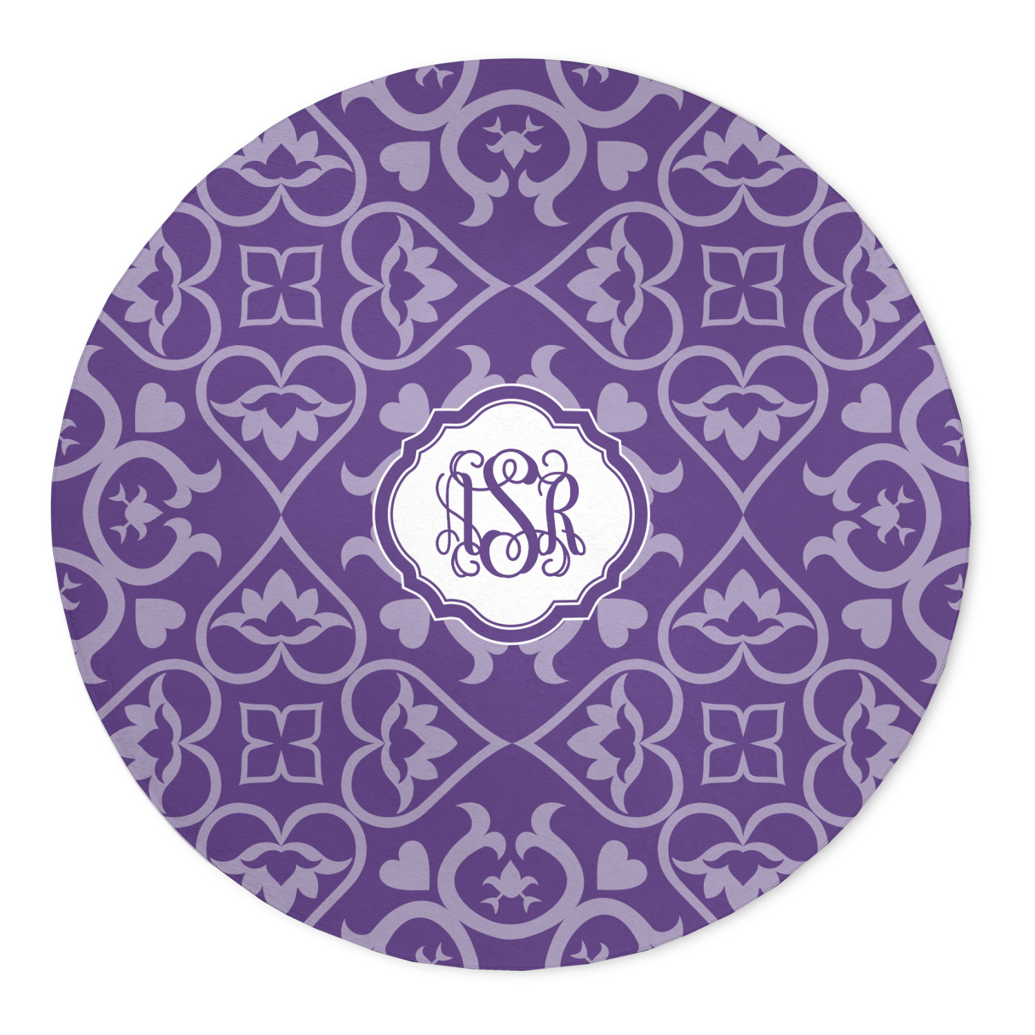 A purple scalloped label highlights a classic personalized monogram or the personalization of your choice.