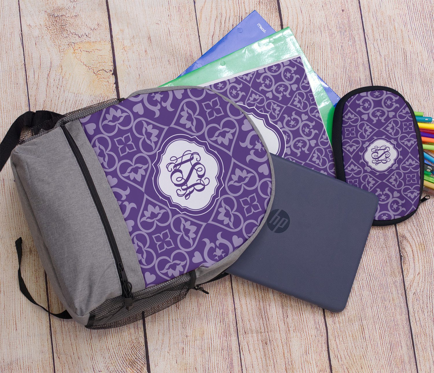 A purple scalloped label highlights a classic personalized monogram or the personalization of your choice.