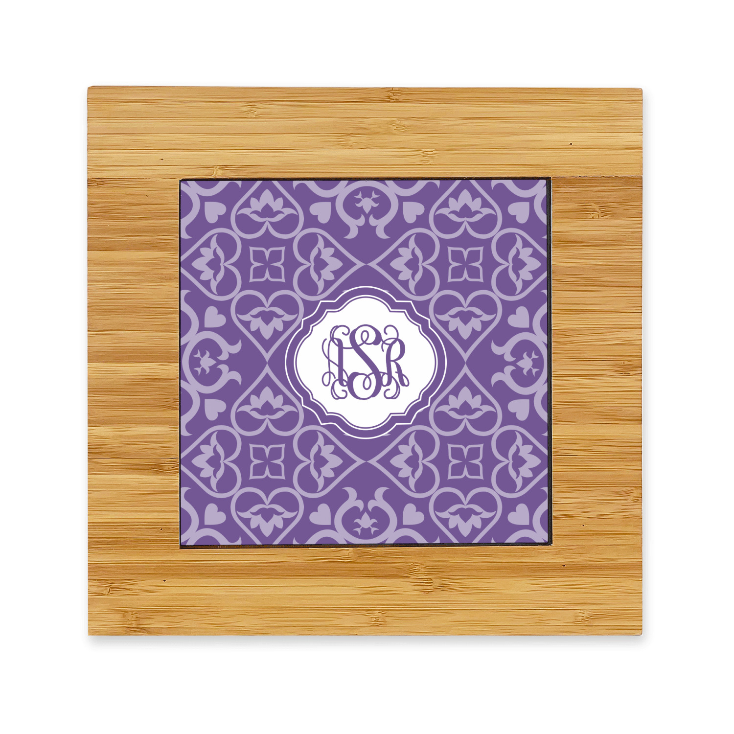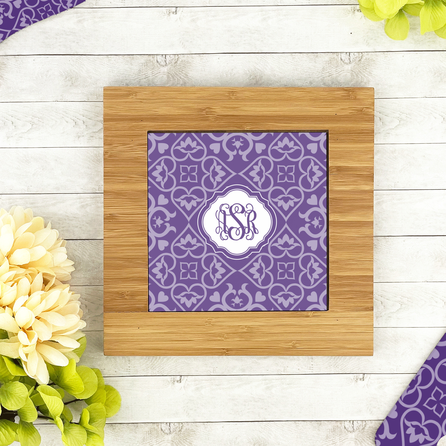 A purple scalloped label highlights a classic personalized monogram or the personalization of your choice.