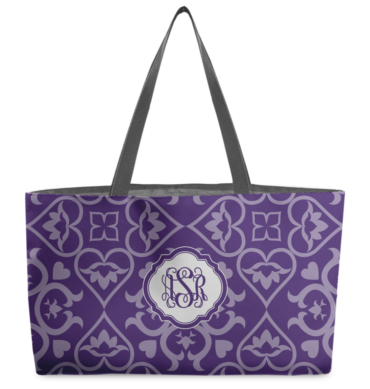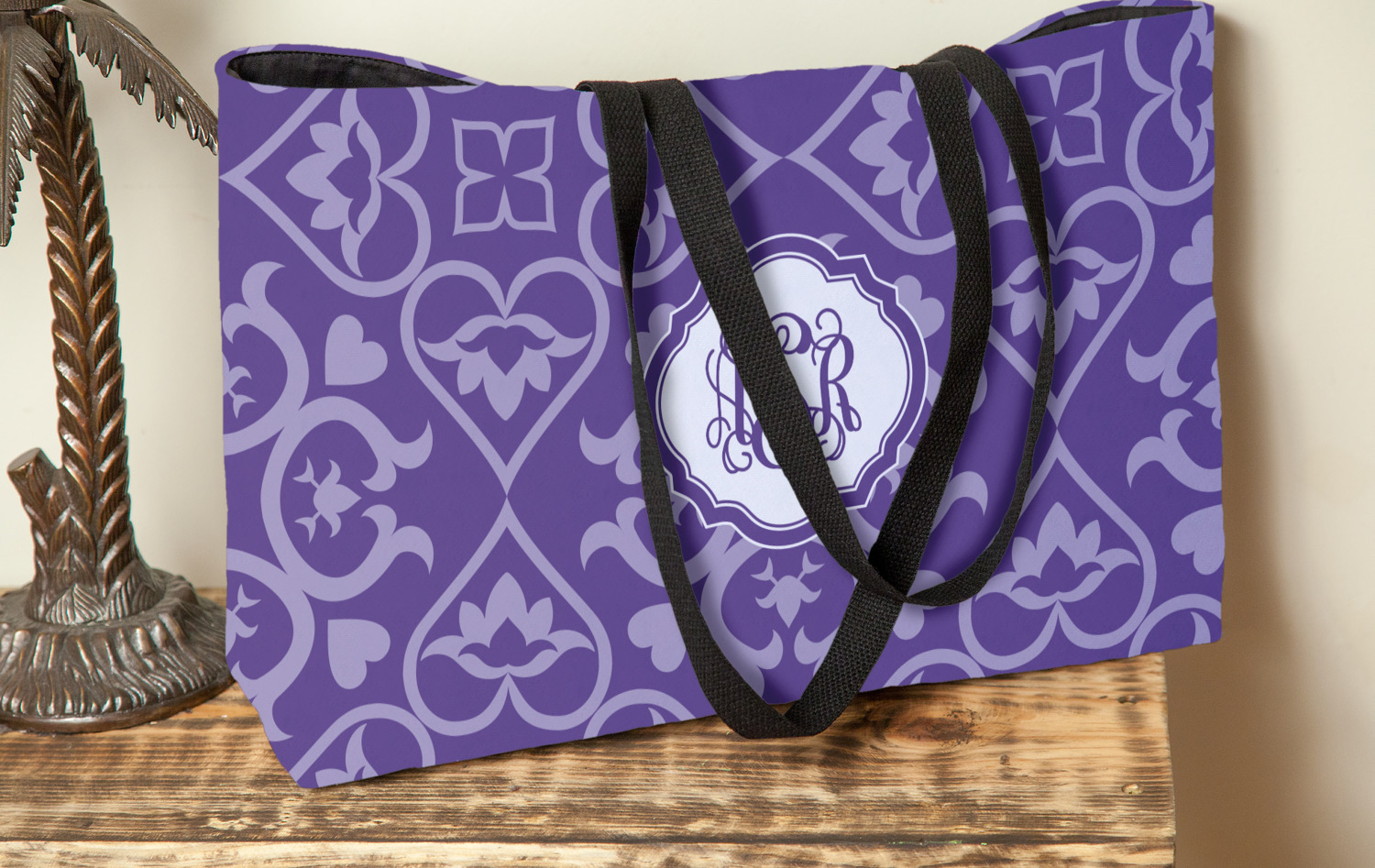 A purple scalloped label highlights a classic personalized monogram or the personalization of your choice.