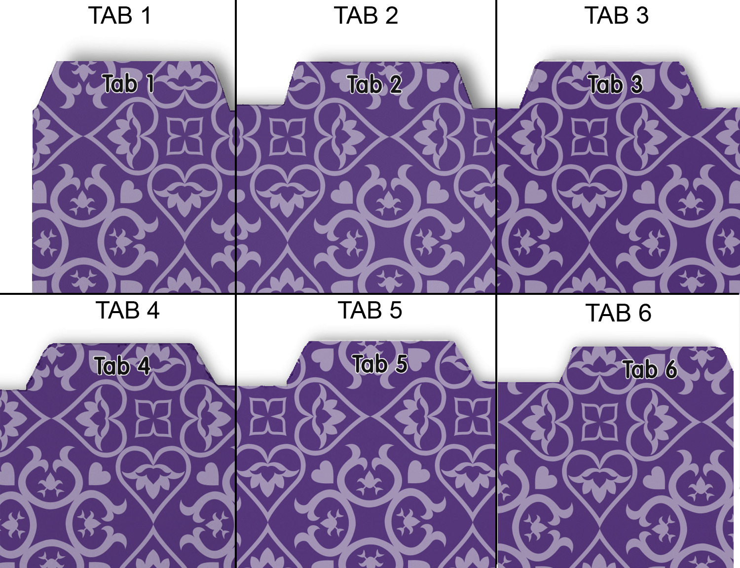 Whether you use binders at school or at work, we have designs to suit all of them. Available in 5 or 6 tab sets, you are sure to find a set to suit your needs. The back of each one is white and can be used to take notes, write vital information on, etc.