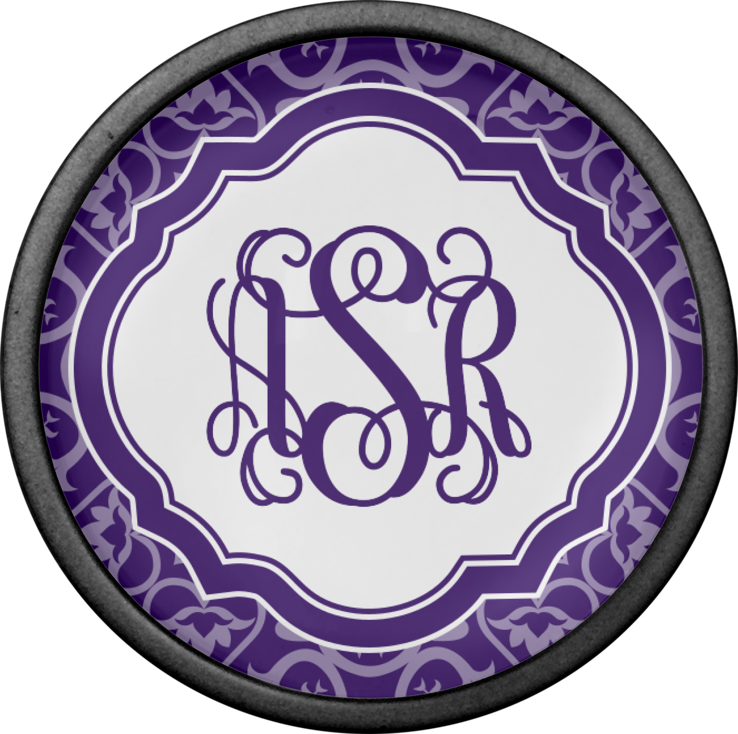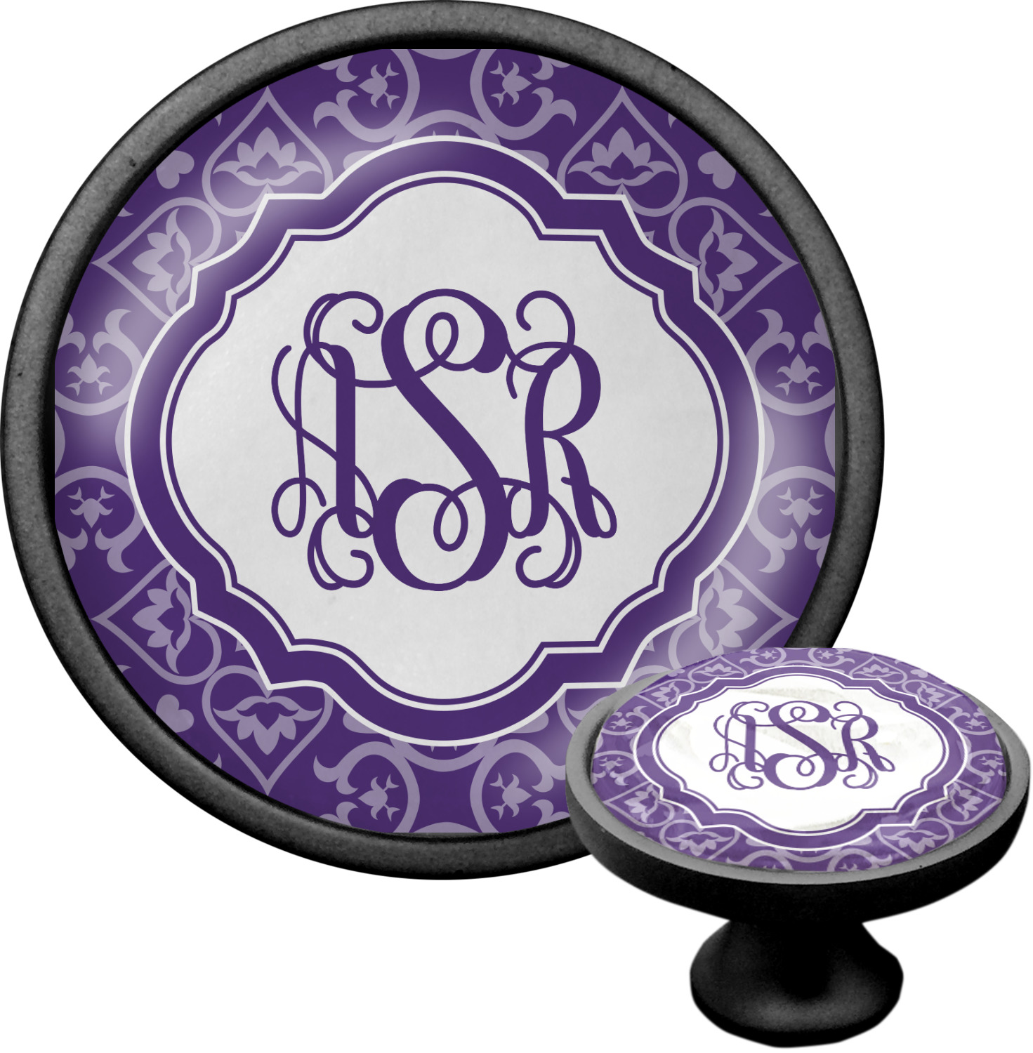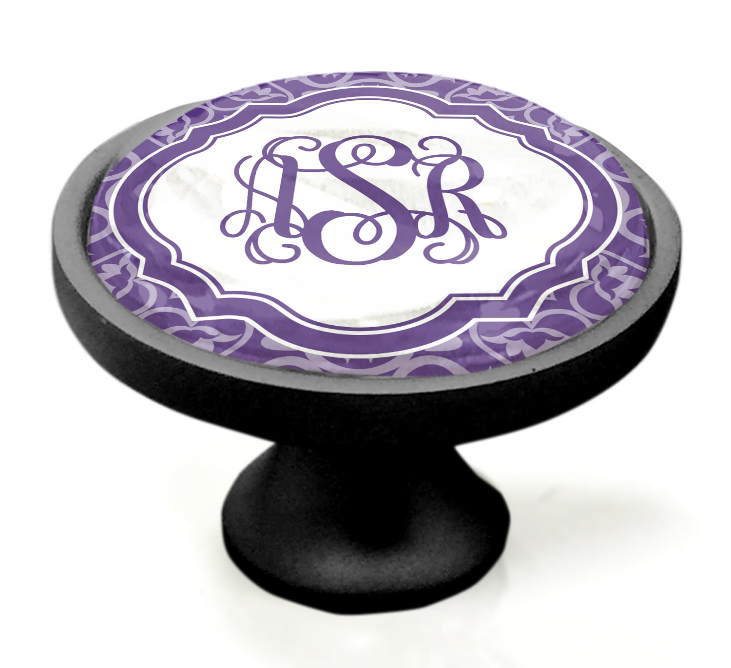 A purple scalloped label highlights a classic personalized monogram or the personalization of your choice.