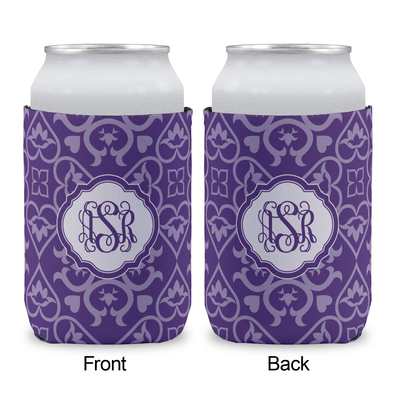 A purple scalloped label highlights a classic personalized monogram or the personalization of your choice.