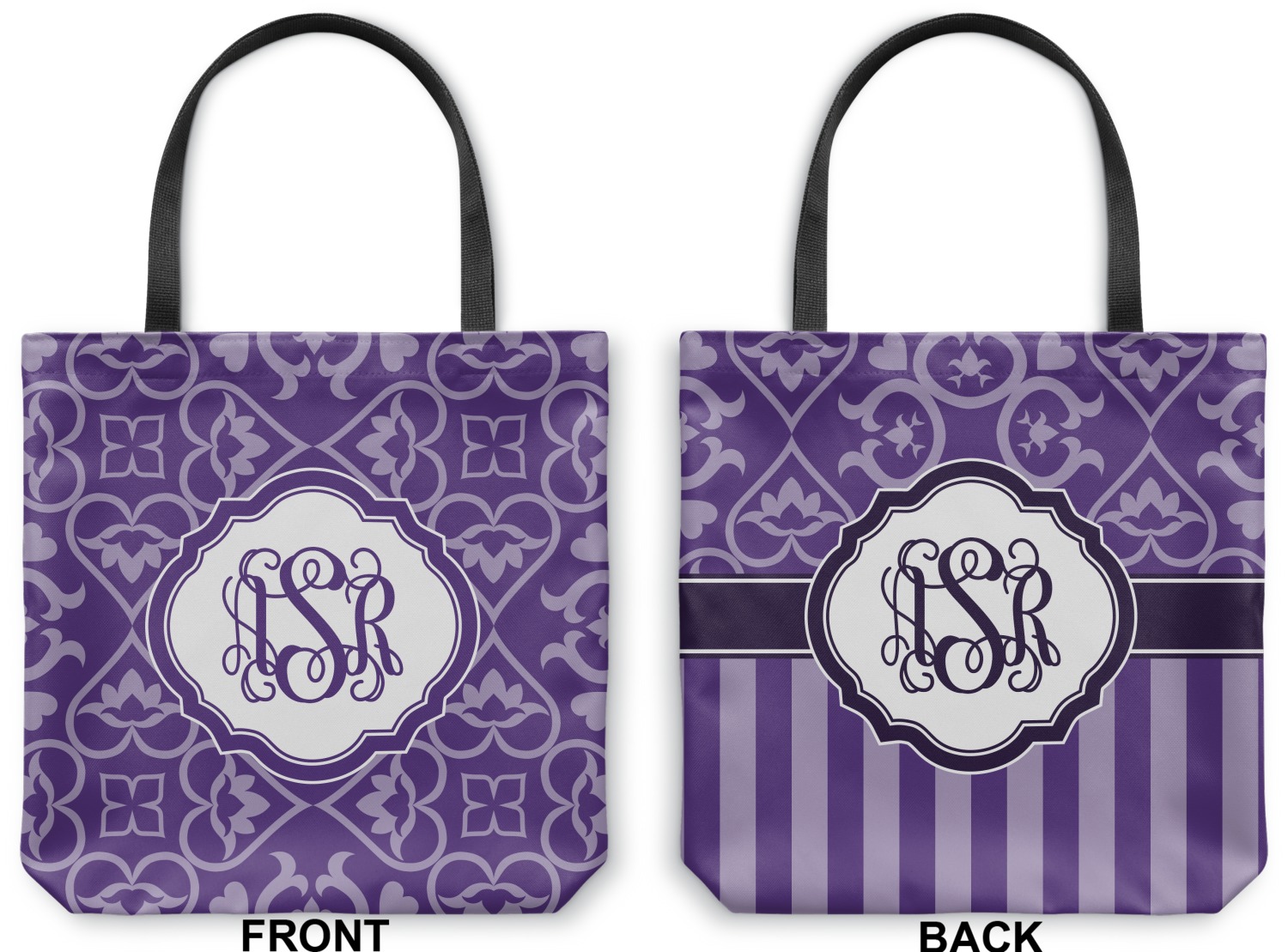 A purple scalloped label highlights a classic personalized monogram or the personalization of your choice.