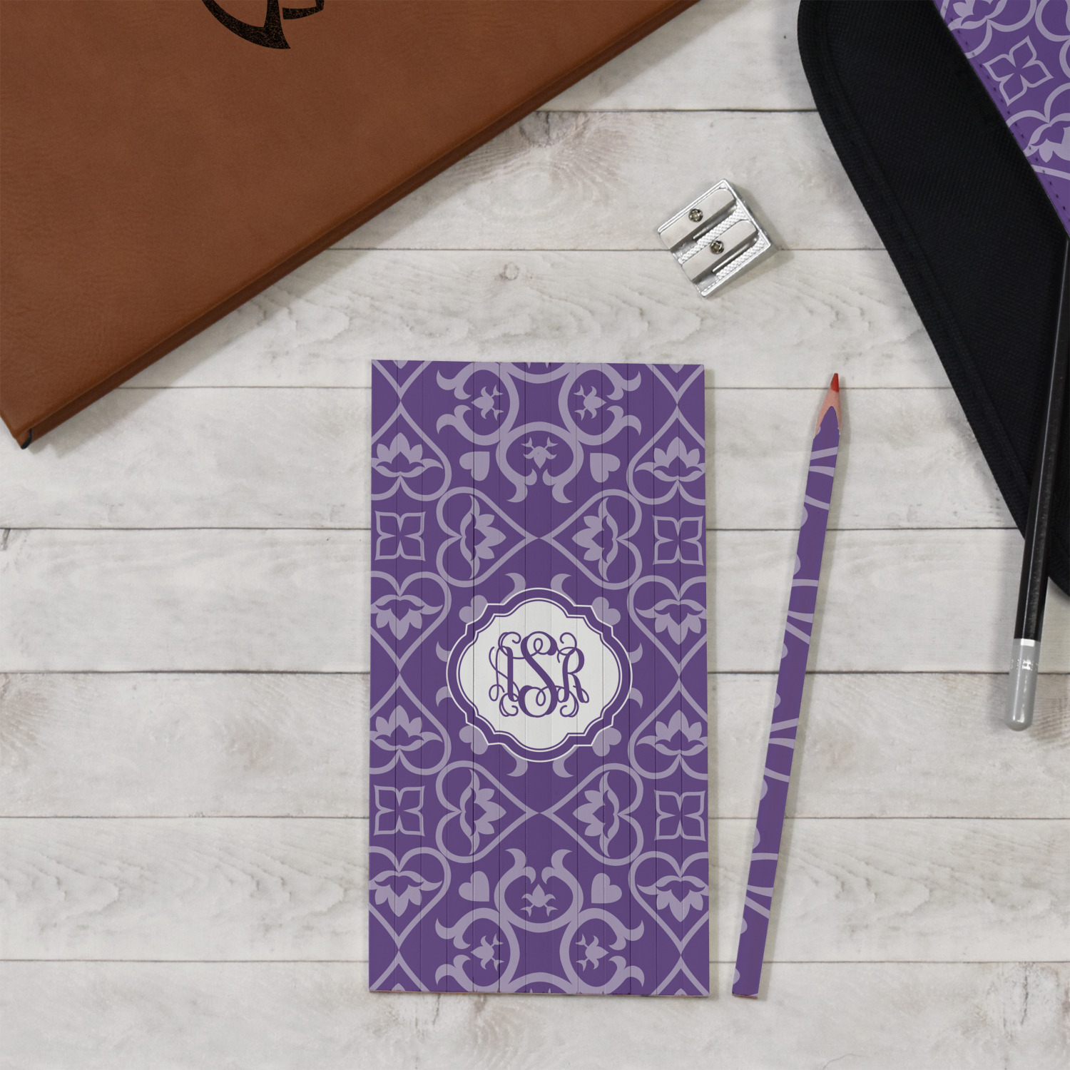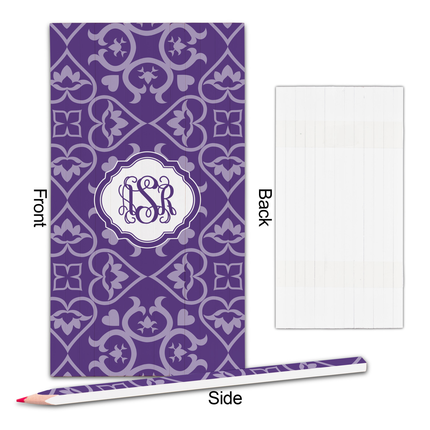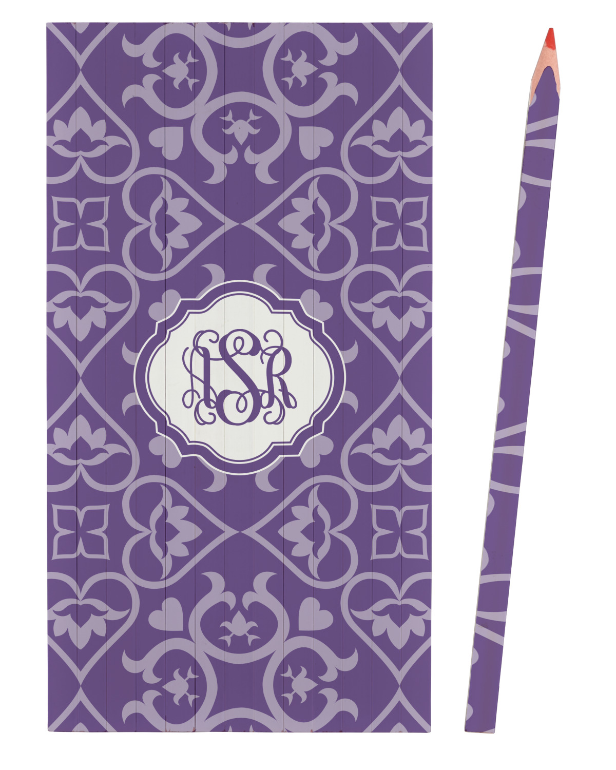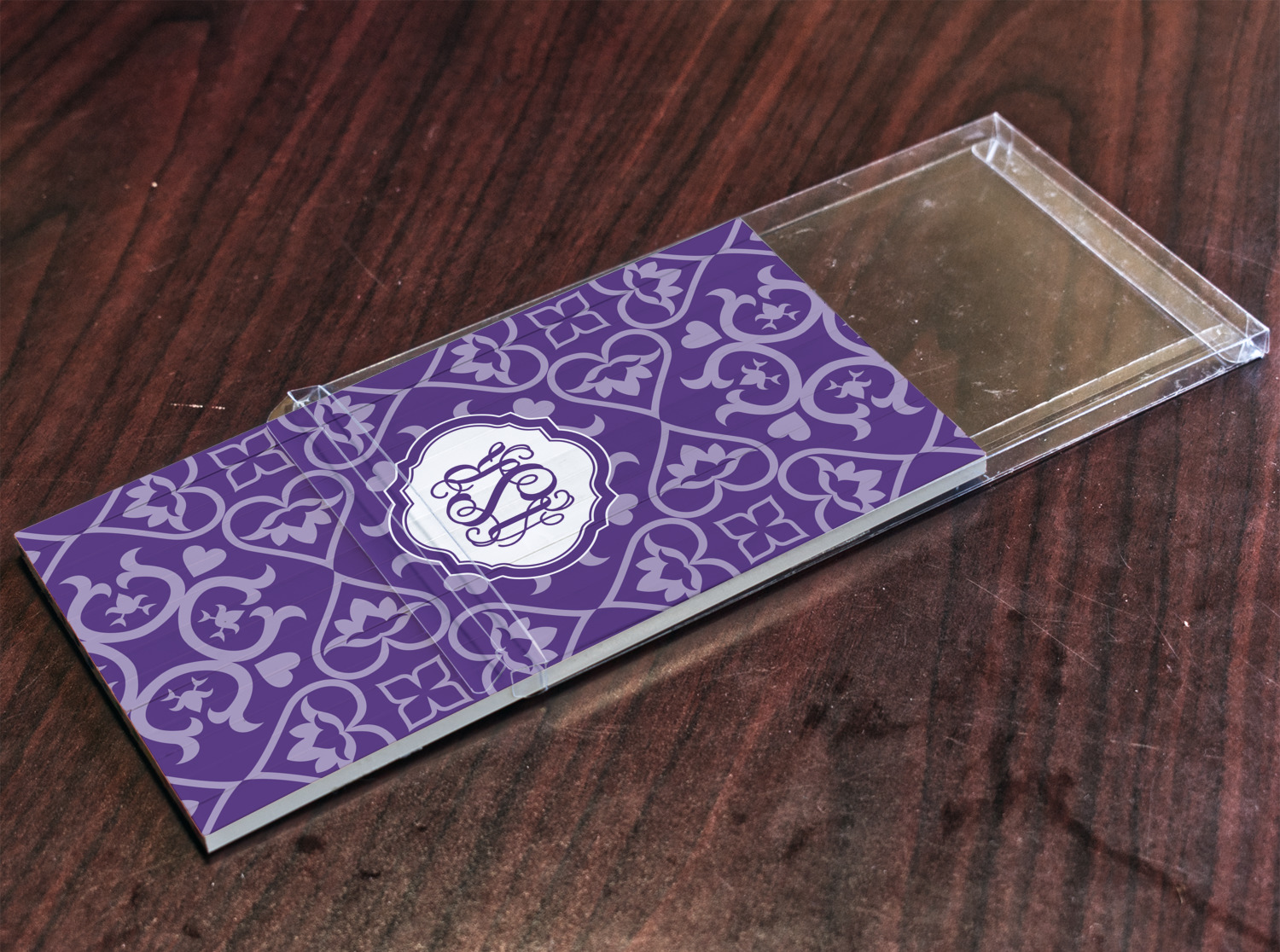 A purple scalloped label highlights a classic personalized monogram or the personalization of your choice.