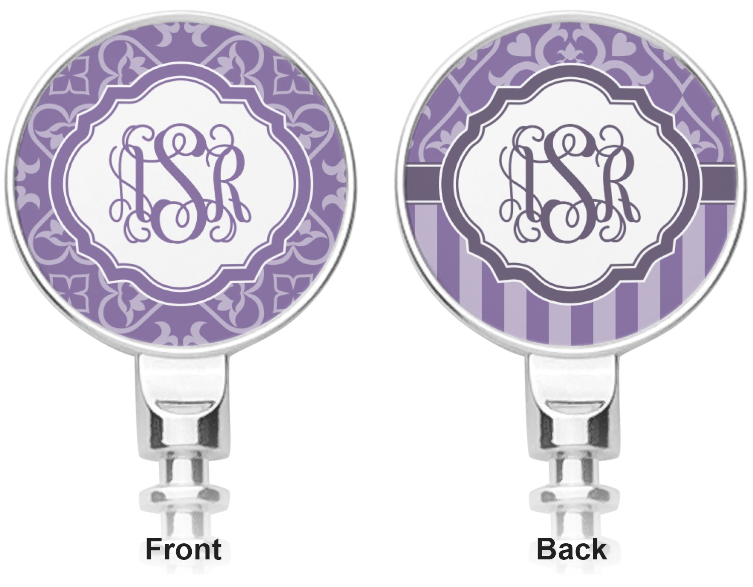 A purple scalloped label highlights a classic personalized monogram or the personalization of your choice.