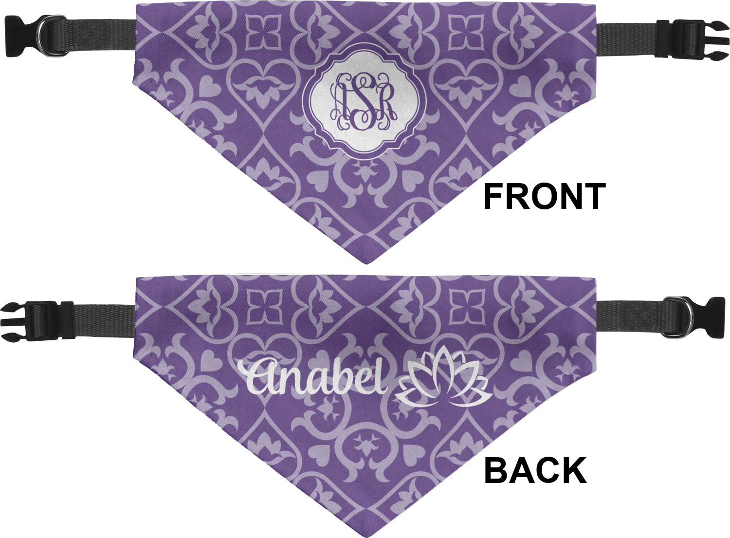 We print the front and back of these dog bandanas with your customized design. The bandana itself is made from a durable polyester, sewn together with a gap large enough to accommodate any collar. Regardless, the bandana includes a plain black, canvas collar with plastic snaps, that can easily be removed if desired. These dog bandana collars are available in four sizes: small, medium, large, and extra large. Please see our sizing chart for more information regarding the dimensions of each size.