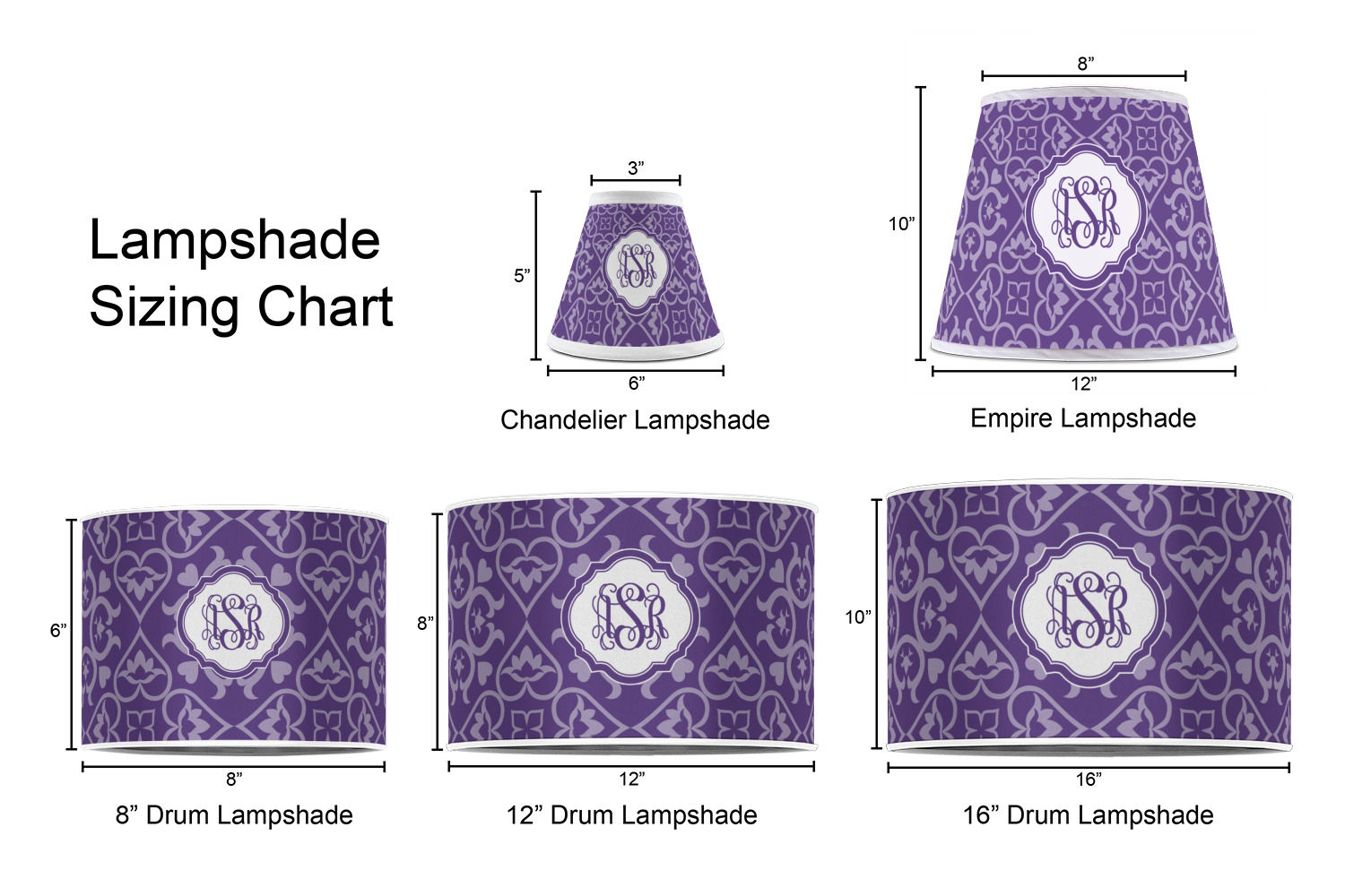 Our customized lamp shades also come in 3 different sizes: 8", 12" and 16", measuring at 8" in diameter by 6" tall, 12" in diameter by 8" tall, and 16" in diameter by 10" tall, respectively.