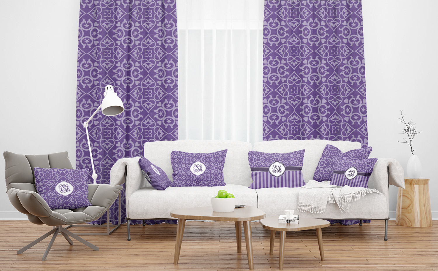 A purple scalloped label highlights a classic personalized monogram or the personalization of your choice.
