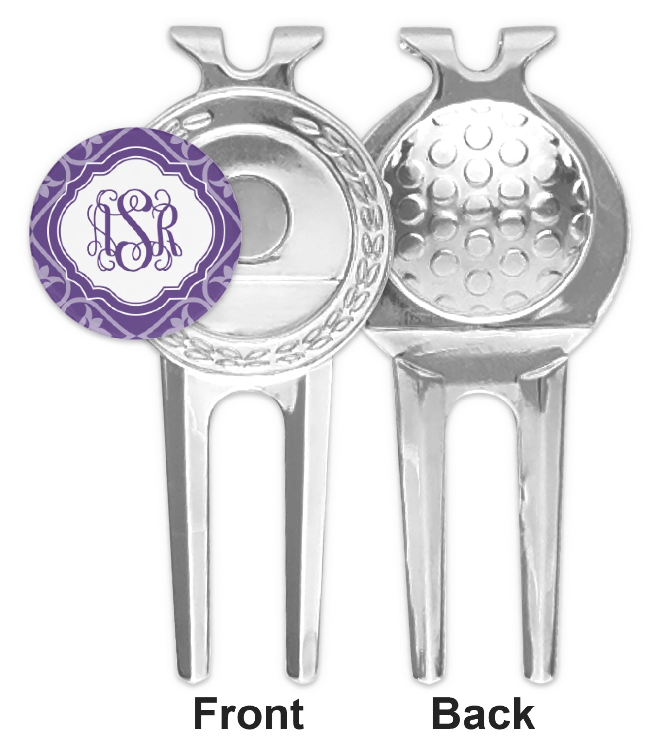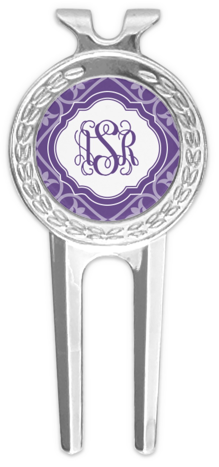 A purple scalloped label highlights a classic personalized monogram or the personalization of your choice.