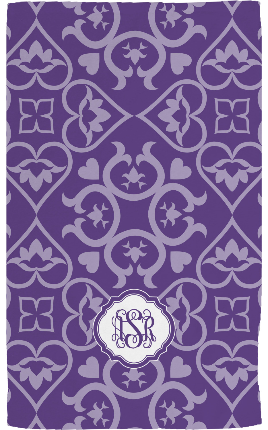 A purple scalloped label highlights a classic personalized monogram or the personalization of your choice.
