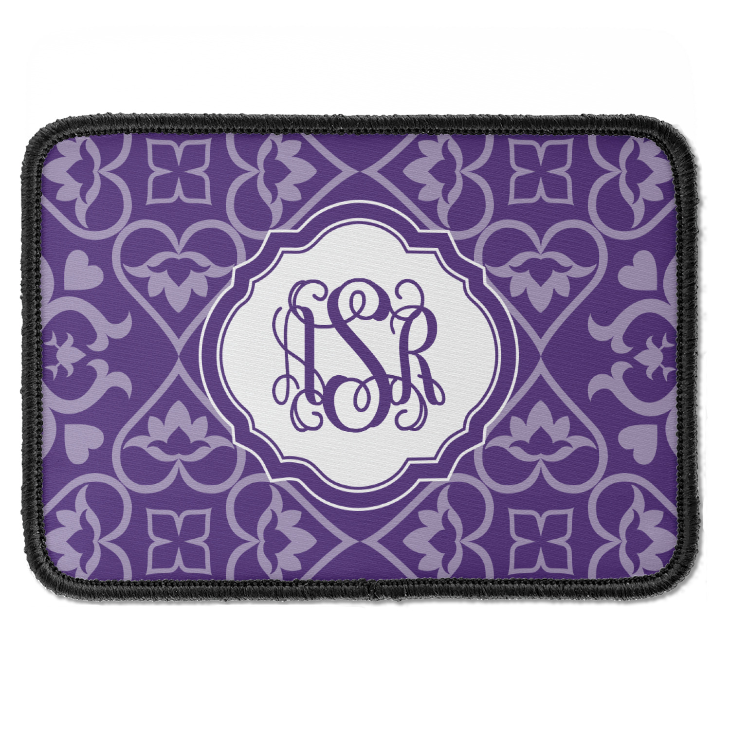 A purple scalloped label highlights a classic personalized monogram or the personalization of your choice.