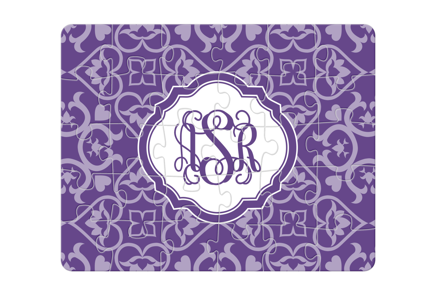 A purple scalloped label highlights a classic personalized monogram or the personalization of your choice.