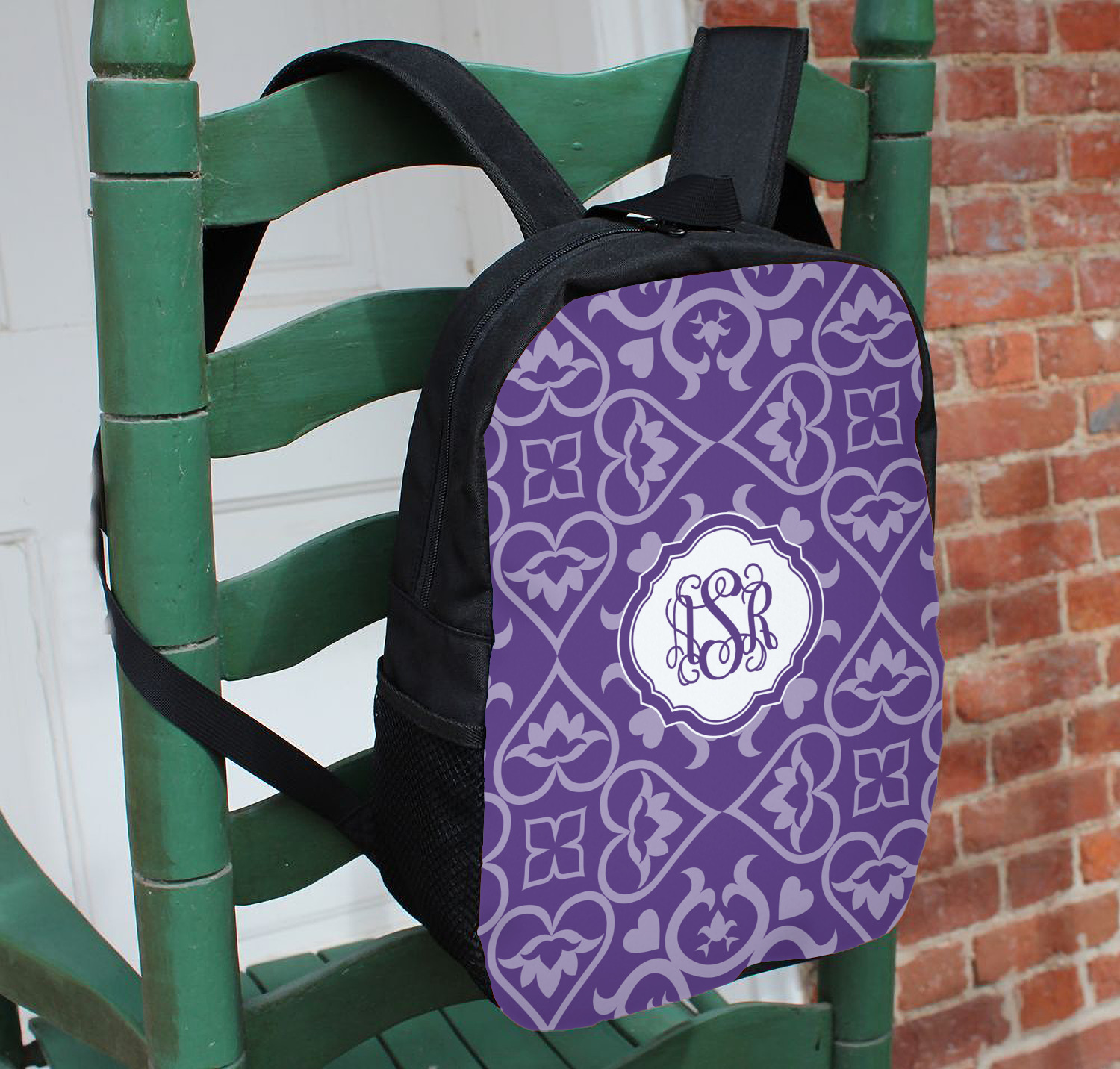 These small backpacks are made of a durable black canvas material with your personalization right on the front. The two shoulder straps are padded and easily adjustable. The bag itself measures at about 11" W x 15" H x 5" D. It's the perfect size for elementary aged kids or adults who want a smaller backpack. On the top of the bag you will find a handle to hang or carry your backpack by as well as a large zipper closure to keep all of your belongings safe inside. On each side of your backpack is a mesh pocket for a small item or water bottle. Inside your backpack you will find a spacious area with a small zipper pocket and a padded laptop slot that will fit up to a 13" laptop (13" being very snug). This is the perfect bag for any student that needs a couple books and their laptop with them at all times. It also works great as a carry on for traveling!