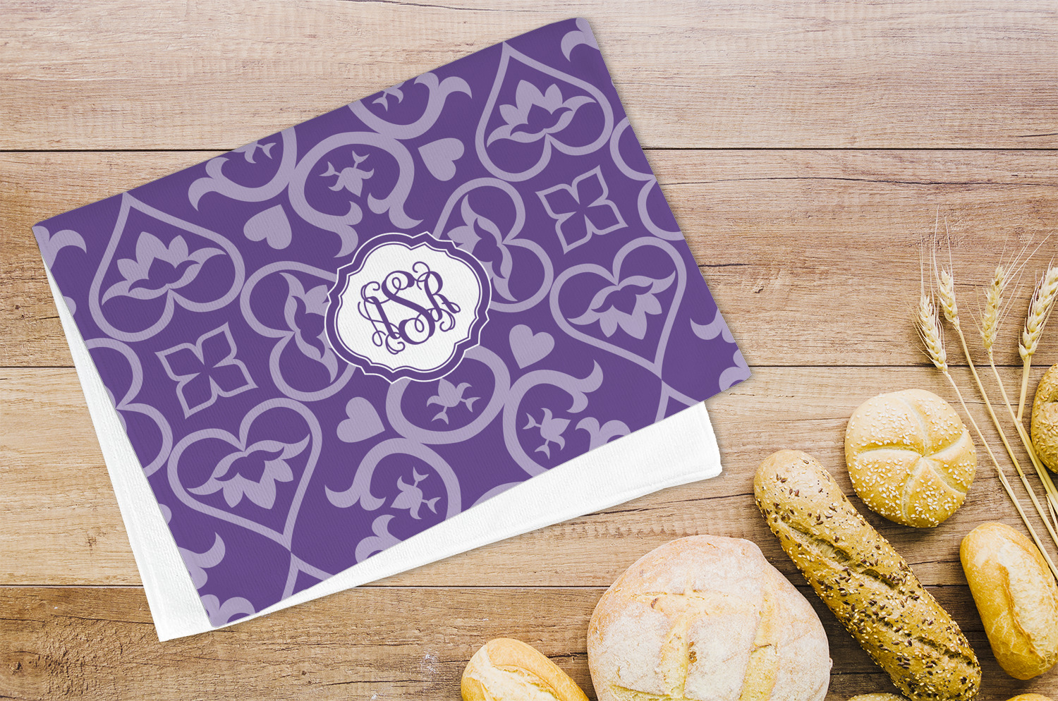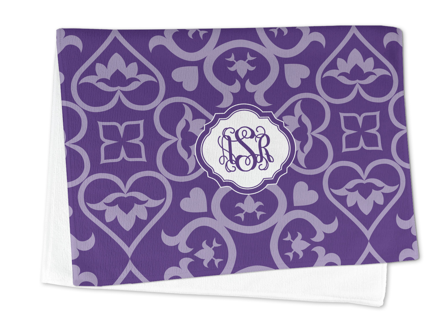 A purple scalloped label highlights a classic personalized monogram or the personalization of your choice.