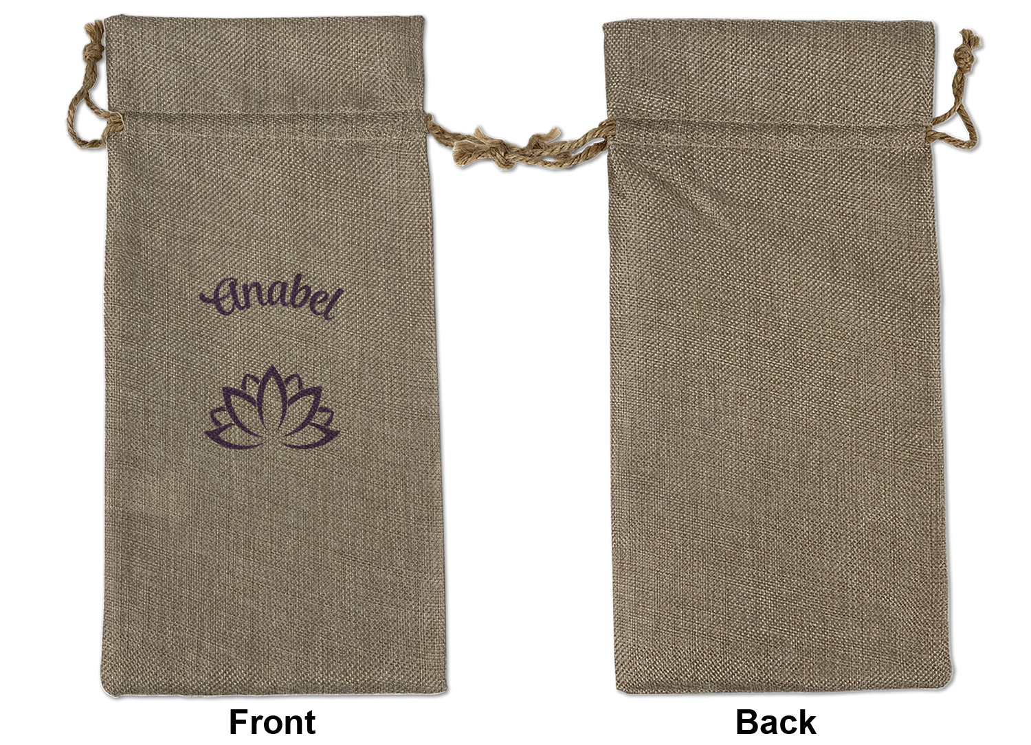 We sell our Burlap Gift Bags in 3 variant sized bags. Made with burlap polyester, each personalized bag can be secured with a twine drawstring pull. Your custom design is available to print on one side or both sides - completely up to you! The sizes of the bags measure approximately 4.5" x 6.5" for the smallest size, 6.5" x 8.0" for the medium size, and 6.5" x 13.5" for the large-sized bag.