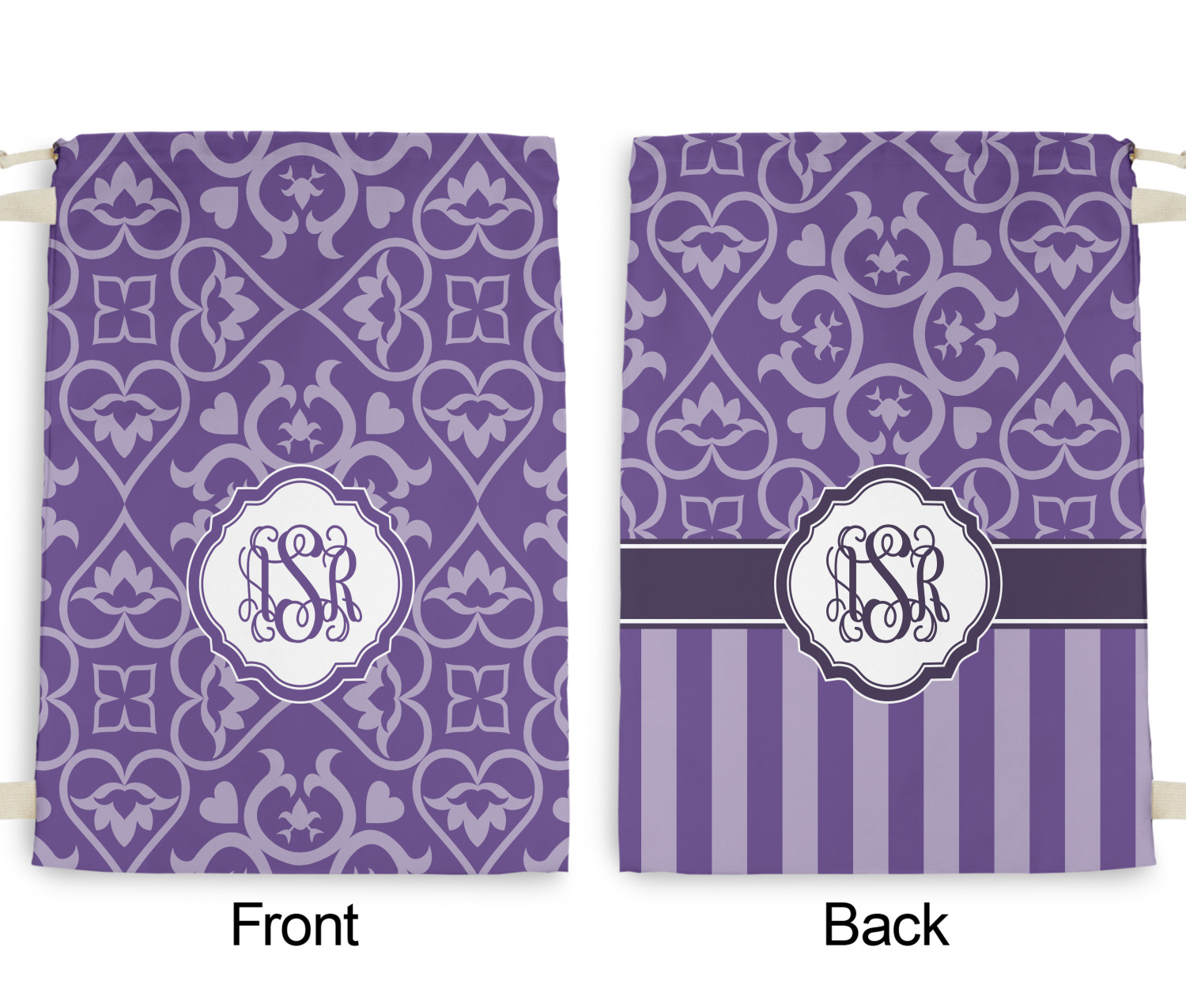 A purple scalloped label highlights a classic personalized monogram or the personalization of your choice.