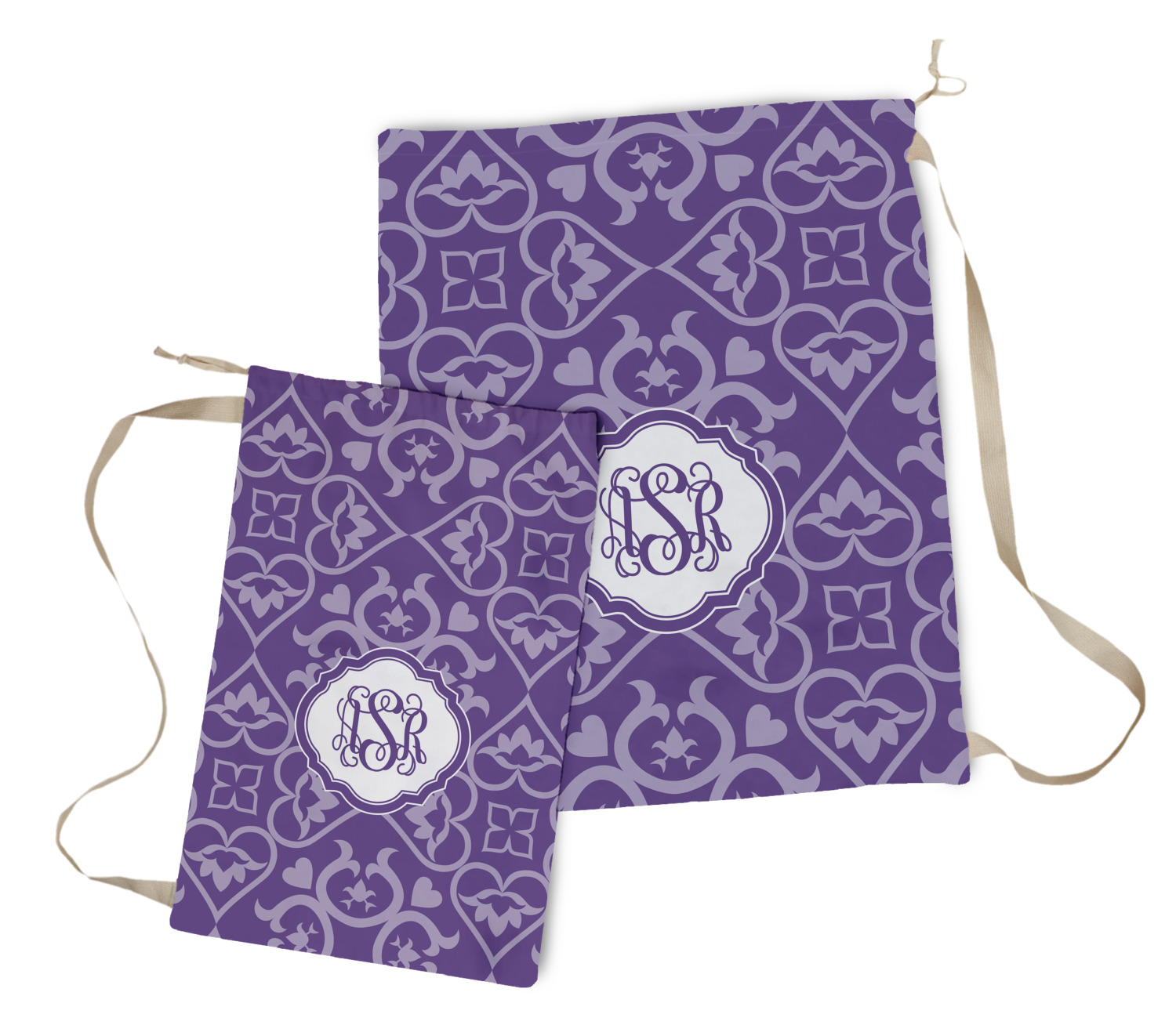 A purple scalloped label highlights a classic personalized monogram or the personalization of your choice.