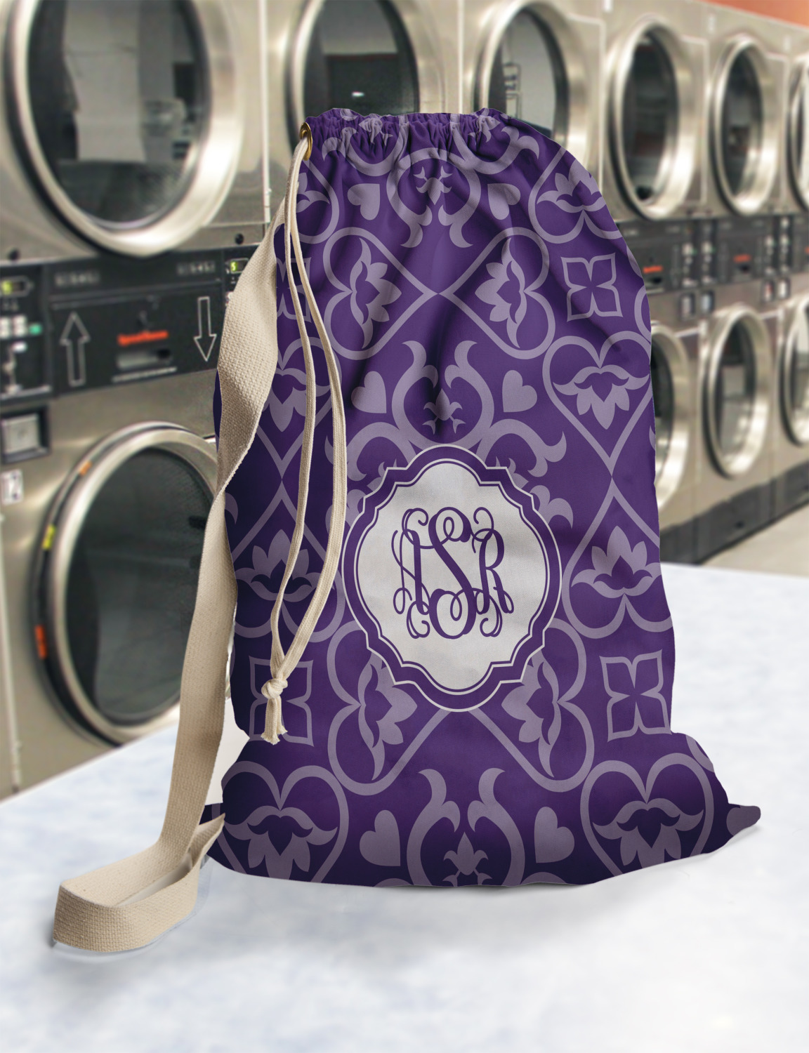 Carry your laundry in style with these customized laundry bags. Available in two sizes, featuring a natural colored woven strap and a cinch cord, these bags hold a lot of clothes or anything else you want to fit in them.