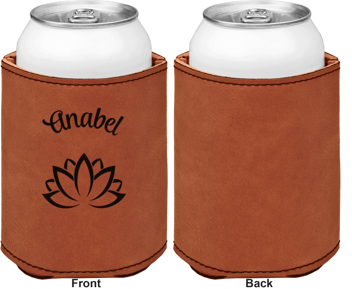 This can sleeve is made from a cognac-brown leatherette and stitched with a sturdy, black thread. A slim padding lines the inside of your can sleeve to allow for a better fit once your drink is inserted. The sleeve itself measures at 4 by 4.5 inches, allowing this custom can sleeve to accommodate most canned drinks. Your personalized design can be engraved on the front and back, or solely the front. When laser-engraved, your design appears as a black coloration which contrasts the leatherette nicely.
